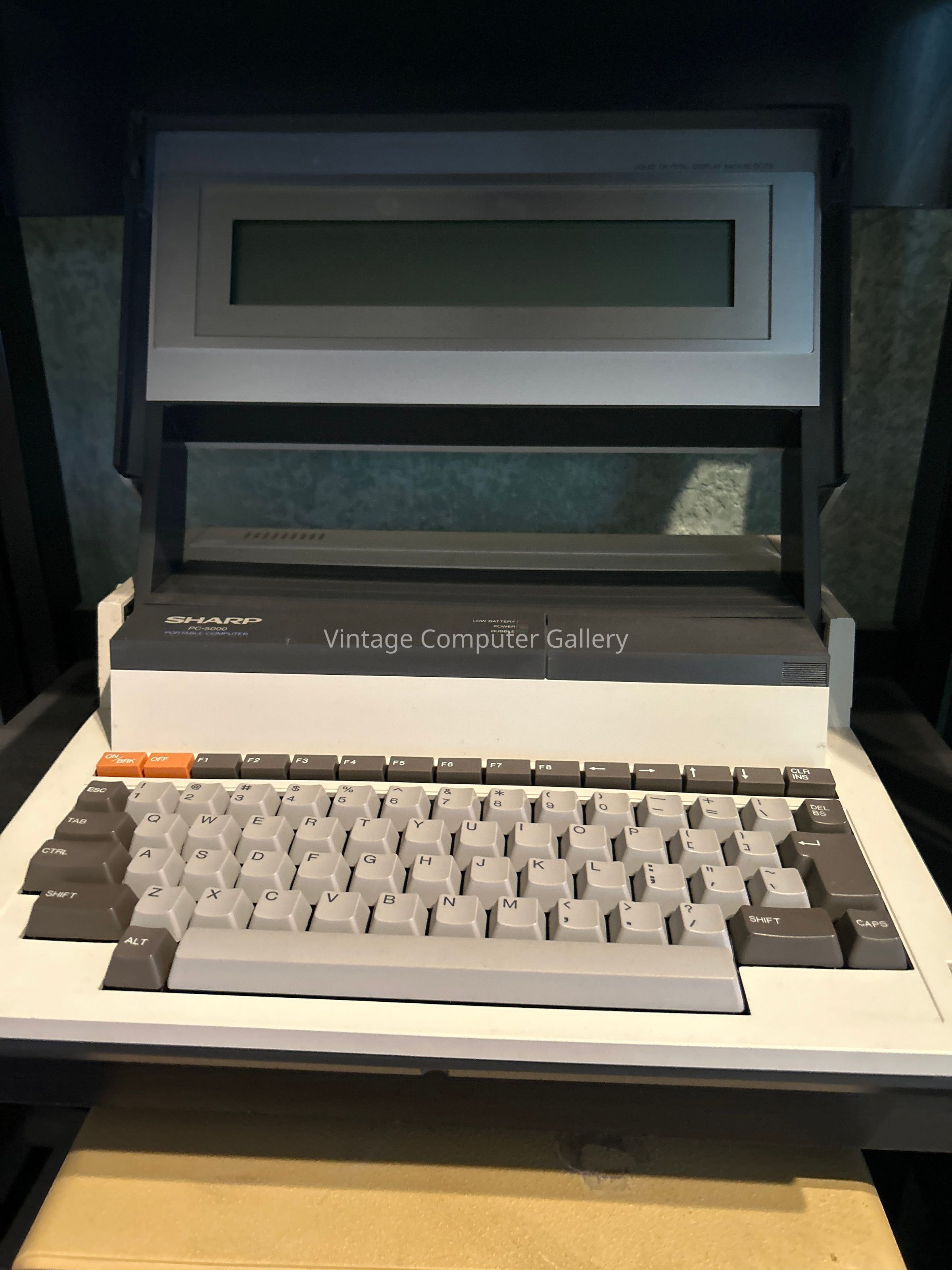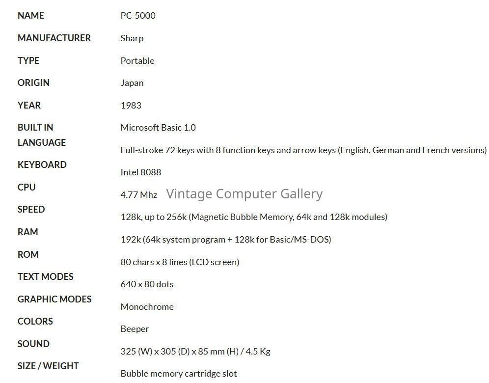 The PC-5000 is the Sharps's first attempt to produce a laptop computer and was one of the first clamshell style portable computer with the Grid Compass and the Gavilan. So it is a clamshell style portable computer: when you open the PC-5000, the LCD screen (8 x 80) is lifted to reach its ''in-use'' position, and when you close the computer the screen tilts until it covers the keyboard. There is an optional printer which can be mounted into the case of the PC-5000 (see picture). The type of memory used here is quite special, it's magnetic bubble memories. The advantage is that it's quite fast and you can change the memory cartridges (64k or 128k each) in the computer. Thus you can reach 256k RAM, or you can insert applications stored on ROM modules. But the main drawback of these memories, is that there are very expensive! The PC-5000 uses MS-DOS but is not really PC compatible, although Sharp tried to sell it by focusing on this point. Some good software was available for the PC-5000, including Easy-Writer II (word processor), Easy-Comm (communications)and Easy-Planner (spreadsheet). There were sold together as the EasyPac (some sources say that Easy-Report was included). EasyMenu was the menu-interface built-in the PC-5000.Acquisition
