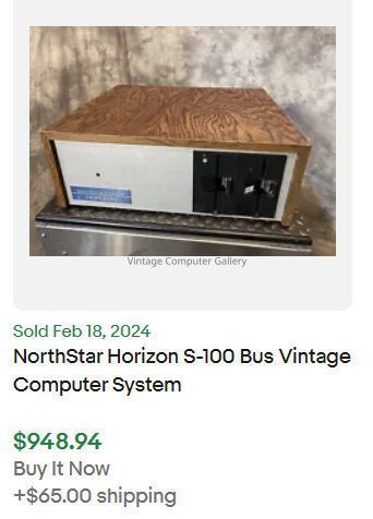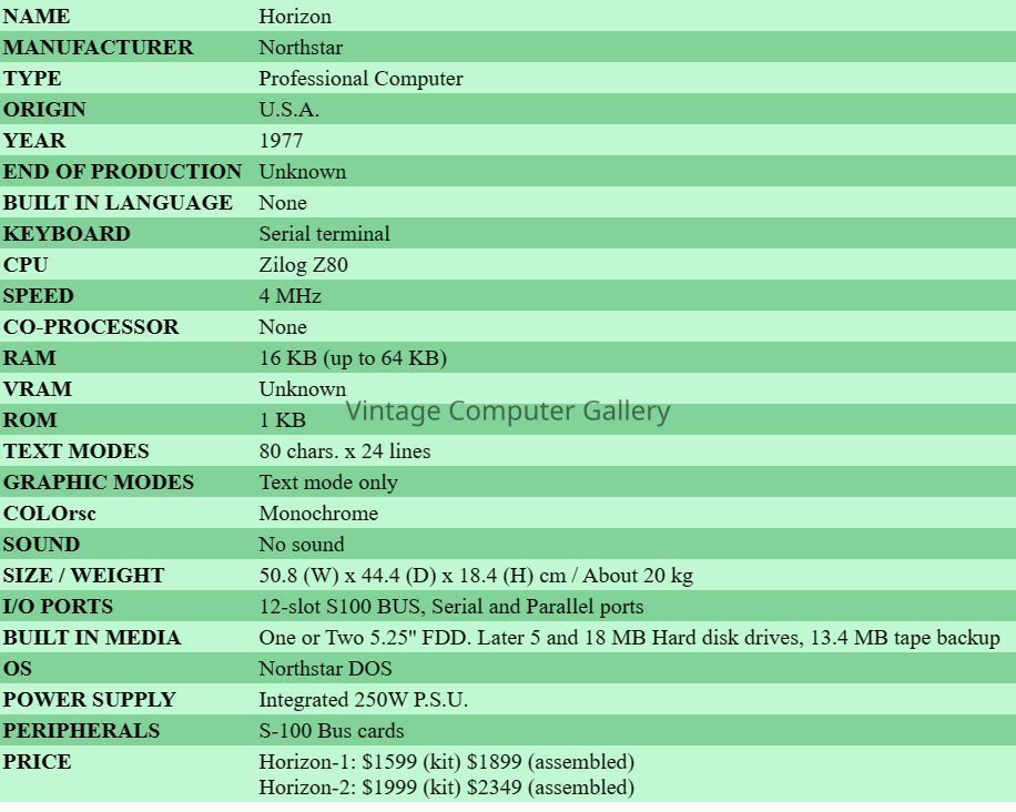 The Horizon was a S-100 bus based system. It was the first floppy-disc based system hobbyists could buy. In a case with a choice of wood or blue metal cover, the basic version included a 4 Mhz. Z80 microprocessor, 16 KB of RAM, a 90 KB 5''1/4 floppy drive with a controller card, a serial terminal interface and 12 S-100 slots. It was sold with the North Star Disc Operating System and a Basic interpreter allowing random and sequential disk files. The Horizon-2 version offered a second floppy-disc drive. Any S-100 cards (compatible with Altair, Cromemco and many other systems) could be added to the system, but North Star provided its own additional 16 KB RAM and hardware floating point boards. In 1979, original 90 KB floppy drives were replaced by Shugart 360 KB models. NorthStar also offered an add-on box with two additional floppies, making a total of 4. The box had a matching walnut-stained plywood cover.Acquisition