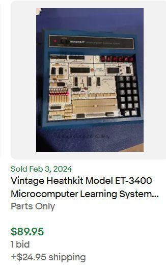 1976- The Heathkit/Zenith MicroComputer Learning System model ET-3400 was a very popular item designed to teach principles of computers and programming at Universities in the 1970s., and to educate the students of internal computer hardware and software components by self-assembly and programming the machine in pure Hexadecimal language. It was delivered in assembled or Kit form. It also featured a prototype area and could be used as a design aid for developing special interface circuitry with common 6820 parallel interface or 6850 asynchronous chips. Several software in ROM were also available. Among them an Assembler and a Tiny BASIC.Acquisition