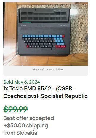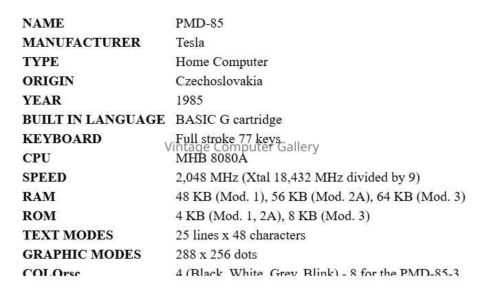 The PMD-85 was a Czechoslovakian personal computer based on the MHB 8080A processor and manufactured by slovakian company Tesla Bratislava. Several versions were available: - PMD-85-1 (most common) - PMD-85-2 (better keyboard and software) - PMD-85-2A (new motherboard) - PMD-85-3 (new motherboard again, pictured) - Mato (kit of a clone in a smaller case) This machine was well known among kids and fans for its presence in schools in 80's.