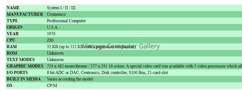 These computers were built around the S100 bus. The S100 BUS was a standard (also known under the name IEEE 696) for connection on Zilog Z80 or Intel 8080 processors. A lot of S100 cards were available for the Cromenco systems. Four Cromenco systems were available : - System 0: Z80 A + RAM 64 KB + 2 floppy disk drives (390 KB each),- System I: As system 0 + 1 hard disk (5 MB).- System III: Z80 CPU, Dual 8" Persci electrically driven floppy drives, 64 KB RAM. It was S-100 bus, Multiuser, used MP/M operating system. In 1982, Cromemco also introduced the CS-1H system using a dual processor board (Motorola 68000 and Z80) and offering 16 MB of address space. For the moment, we don't know exactly the specific features for the Systems II and IV. These systems ran under Cromix (the Cromenco Unix version). They could run under CP/M and CDOS too (CDOS is a CP/M like operating system). Several languages were developed especially for these computers: Fortran IV or a 16 K Z80 Basic which was given as "one of the fastest and most capable. Full 14-digit precision".Acquisition