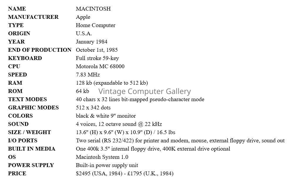 1984- With their II and III series getting rather long in the tooth, and the Lisa being rather pricey, Apple had to do something to get back into the small-business market. They did. The Macintosh can be considered the very first commercially successful computer to use a GUI (Graphical User Interface). It was, however, not the first GUI based computer, the first GUI based computer ever sold was the Xerox Star 8010 in 1981. It was launched a while after the Lisa and was a very attractive alternative to PC compatibles and their old MS-DOS, and text-based applications. After uncertain beginnings, it met with great success despite having no hard disk, single-sided floppy disks, no expansion slot and very little memory! It was replaced later by the Macintosh 512 (the same but with 512 KB RAM) then later, by the Macintosh Plus. The Macintosh 128 and Macintosh 512 were non-upgradeable, non-expandable in almost all departments, but especially with regard to memory. The 128 and 512 had memory chips soldered directly to the main logic board. The original System file was designated 'Macintosh System 1.0'. Apple went as far as System 7 before changing the name to 'Mac OS'. The System/Finder suite was designated 'Macintosh System Software 0.0.'. It wasn't until System 6 that the System file version and System Software designation coincided.Acquisition