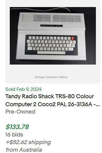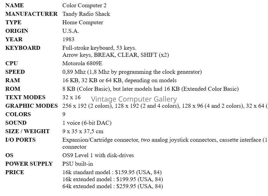 1983- The Color Computer 2 (coco2) replaced the Color Computer "Model 1" in 1983. It has the same characteristics than the Model 1 but has a better keyboard and a more integrated circuitry. There were several models of the Coco2, some with only 8k ROM (Color Basic) called Standard Color Computer 2, and others with 16k ROM (Extended Color Basic) called the Extended Color Computer 2. Some later models differ also in RAM capacity (16k, 32k or 64k). It was replaced with the Color Computer 3 in 1986.Acquisition