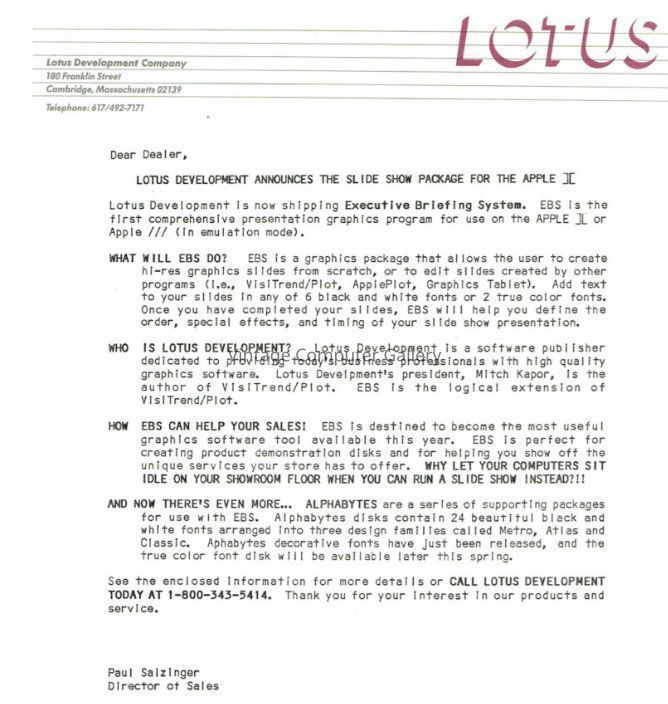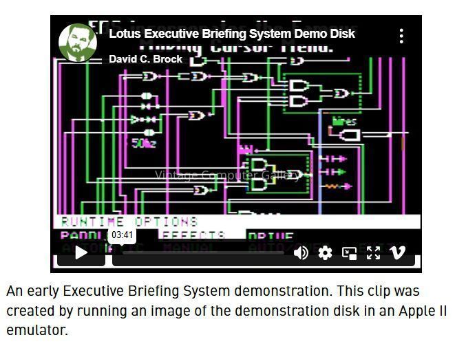 Mitch Kapor had written a statistical analysis and data graphing program for the Apple II called TinyTROLL, which he sold through a partnership with his friend and then MIT finance PhD student Eric Rosenfeld who had suggested the program to Kapor. The partnership was called Micro Finance Systems, and Kapor was approached VisiCorp to adapt TinyTROLL to work with data imported from VisiCalc. Kapor soon delivered VisiPlot and VisiTrend, programs that took VisiCalc spreadsheet data and generated pie, bar, and line graphs from them, as well as performed various finance-relevant statistical functions on the data. Kapor and Rosenfeld’s Micro Finance Systems received hundreds of thousands of dollars in royalties for VisiPlot and VisiTrend before VisiCorp bought them outright for $1.2 million. With his share in the windfall, Kapor set up an integrated software manufacturer of his own, Lotus Development, and, in 1982, the firm released its first product, Executive Briefing System, for the Apple II. Todd Agulnick, a 14-year-old high school student, had been hired by Kapor and wrote the BASIC code for Executive Briefing System under his direction.9Note