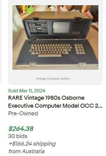 1982- The Executive is the successor of the Osborne 1, from which it keeps the good points and correct its flaws. More memory, bigger screen, more powerful software and... higher price. When closed, the Executive looks like a sewing machine! Once opened, the detachable keyboard is connected to the main unit through a quite short coiled cord. The keyboard can be tilted for a better typing. It has a separated numeric keypad and 4 cursor keys. The layout of these keys is not very convenient. There is "left" & "up" on one row, and "down" & "right" on the other... The front panel of the Executive is divided in four parts. In the center, one can find the built-in amber monitor (13 x 10 cm) bigger than the Osborne 1 one. On the right hand side, there is the fan grid, the Executive logo and the on/off button. The two 5.25" half-height disk drives, are mounted horizontaly just above an empty disk storage space. Different connectors are placed at the bottom of the front panel: two RS232c/serial (for printers and modem), one Centronics and the keyboard connector. Next to them are brightness and contrast control knobs, as well as a reset button. At the back of the system is the handle to carry the system once it is closed. Under this handle is the fan trap door, which you have to open before starting to work. The Executive has of course its own power supply unit, but what is more uncommon, is that it can accept 110v or 220v, the system will convert both. This was useful for people traveling a lot. The built-in monitor was the main flaw of the Osborne 1. This tiny screen was displaying 52 of 132 virtual columns (this was done by scrolling), resulting in 2 mm high characters! The Executive has a wider screen which can really display 80 columns, though some critics said it was still too small. The characters can be displayed in normal mode, half intensity, inverse or blink. Two-character sets are available, and independent windows can be defined.Acquisition