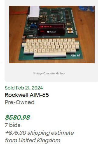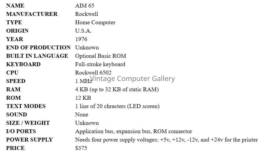 This strange computer was designed to be a development system for 6502 based computers. It had no display except for a small 20 character LED screen and a very small thermal printer located directly on the motherboard which could print everything that was typed on the keyboard. The board featured five 4 KB-ROM sockets. Two of them were dedicated to the AIM monitor program, including an instant input assembler (no labels) and a disassembler. Various programming languages (BASIC, FORTH...) or custom applications could be added in the three remaining sockets. Several cards were developed for this machine, especially language cards and ROMs: a BASIC card (BASIC language with floating point mathematics capabilities), PL/65 (a mixture of the PL/1 and Algol languages), Instant Pascal (an interpreted version of Pascal), Assembler and the FORTH programming language.Acquisition
