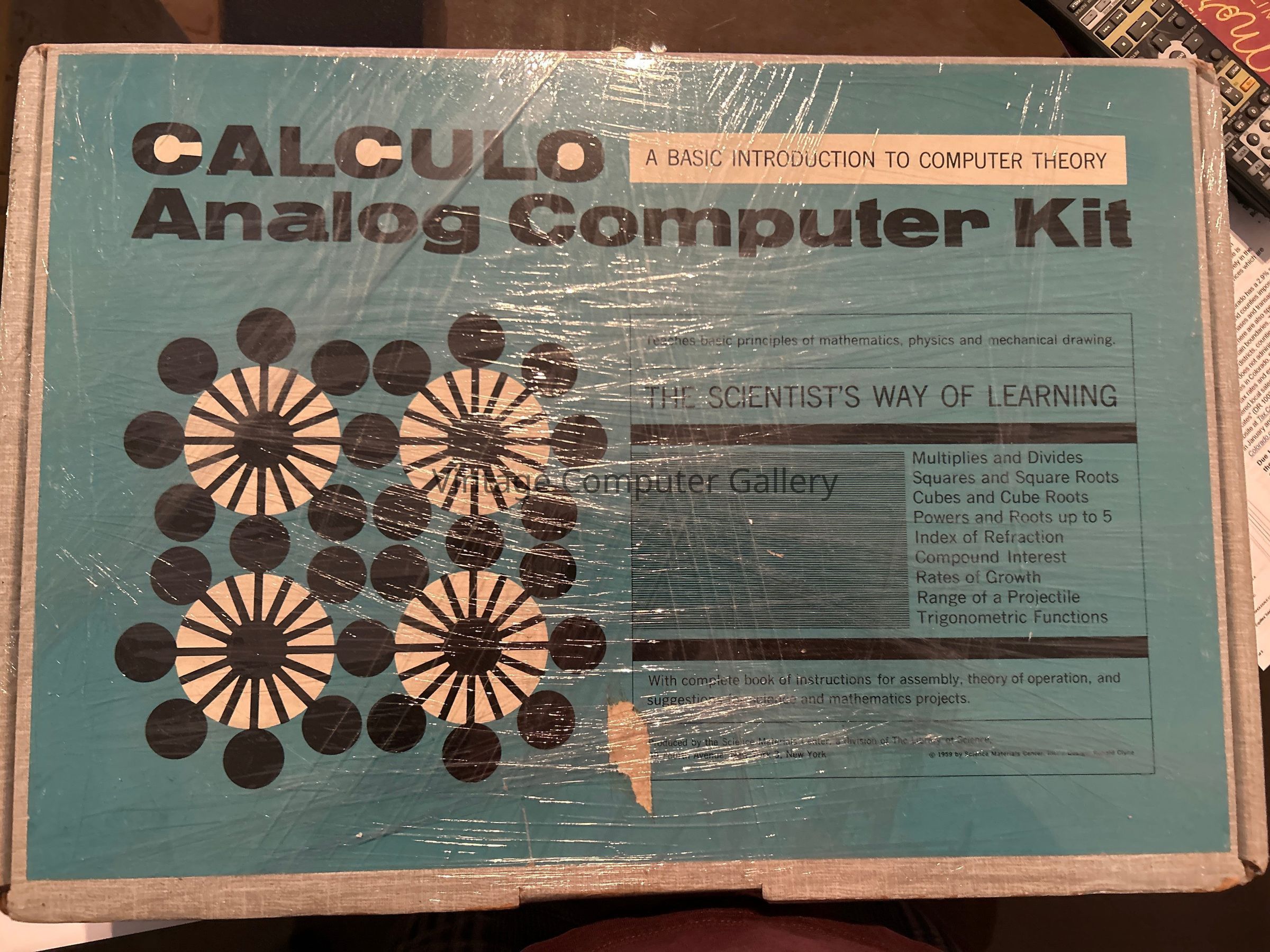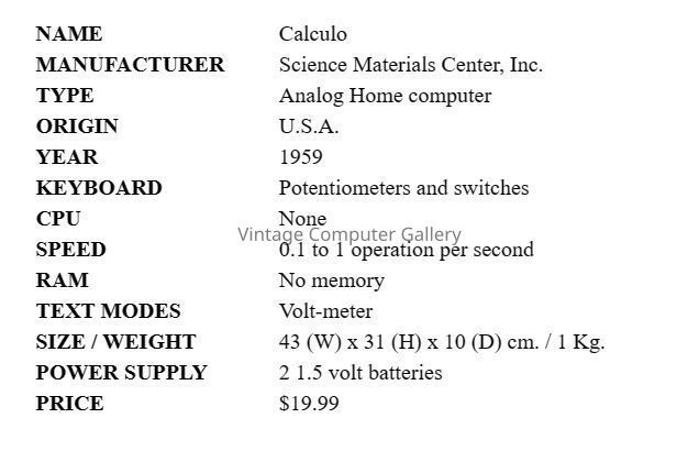 1959- The low cost Calculo Analog Computer was designed as by Science Material Center, Inc. as a basic introduction to the general method of operating analog computers. It has an accuracy in multiplication and division of about 5%, though it could be increased somewhat by means of certain tricks offered by the manufacturer. With such accuracy the purpose of the computer was not to serve as an accurate computing device, but rather as an estimating machine. The Calculo Analog Computer is capable of the following calculations: - Multiplication - Division - Roots - Powers - Calculation of a compound interest - Trigonometric formulasAcquisition