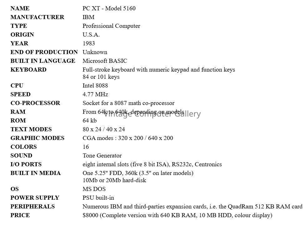 1983- The IBM PC XT is the successor of the IBM PC. The XT stands for EXtended Technology and was introduced in early 1983. It has enhanced features: CGA graphic card, hard disk, more memory, and no more tape port (!). But it wasn't very innovative. There are in fact two versions of the XT motherboard. The first one can accept from 64k to 256k RAM, whereas the later one has support for 640K RAM max, the 101-key keyboard, a 3.5'' FDD and a few other details... In addition to the removal of the cassette port, the XT also had eight 8-bit ISA expansion slots VS the PC's five. The XT's slots were also positioned closer together, the same spacing all PCs still use today. This made old PC's totally worthless because you couldn't buy an XT clone board and drop it into a PC case. Eight slots was a huge boon to the "power user" who had previously found himself having to pick and choose what upgrades to install in the paltry five slots of the PC. The 5160 was replaced with the PC XT S (20 MB Hard disk, slim size floppy disk unit, 640 KB RAM), then with the PC XT 286.