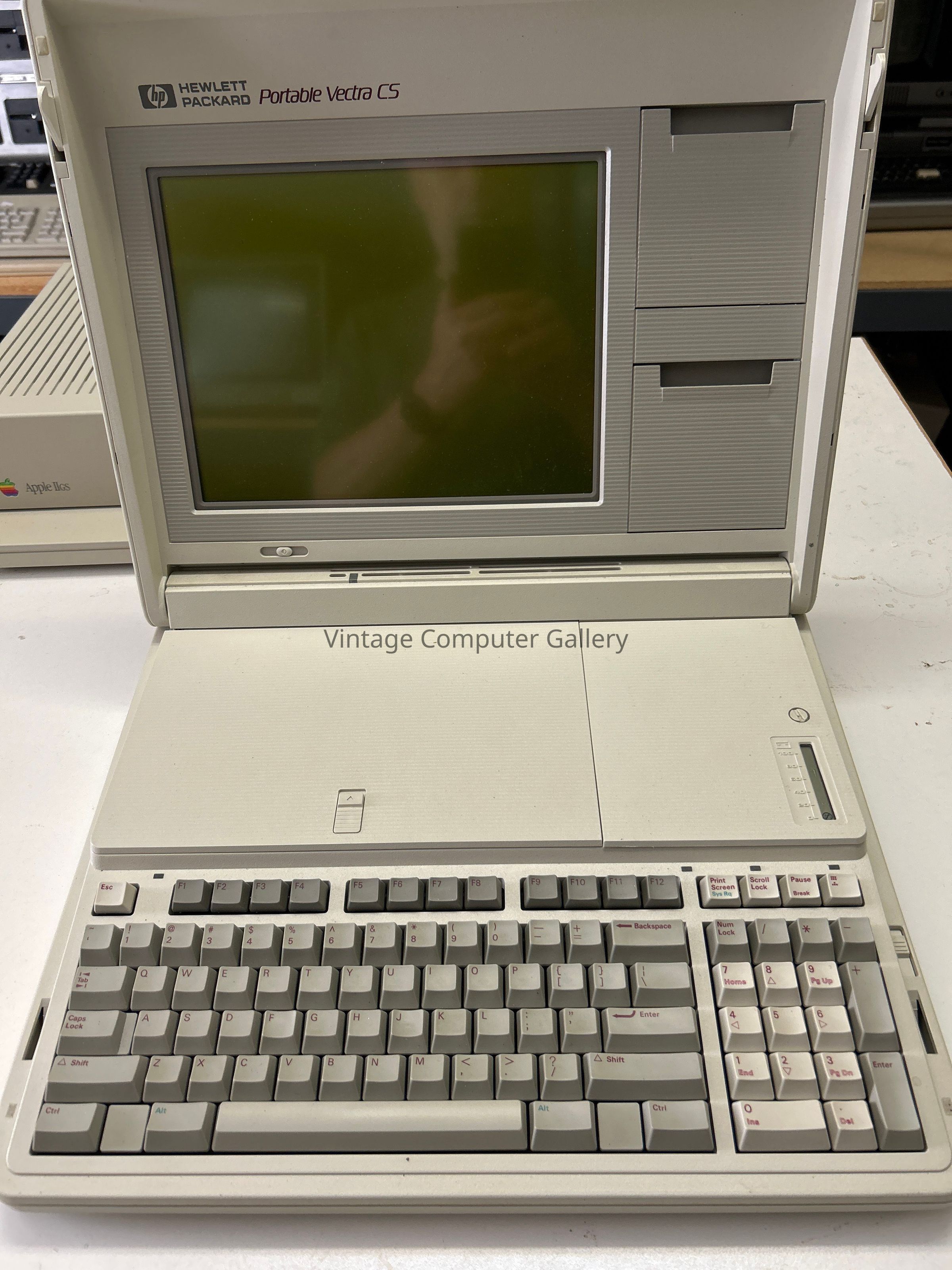 1987- The portable version of the Vectra CS. The Portable CS had a large LCD screen as well as CGA adaptor for use with an external monitor. The Portable was offered in two mass storage configurations: dual 3.5 inch (1.44 Mb) floppy disc drives - P/N D1001A, or a floppy disc drive and a 20 Mb hard disc drive - P/N D1009A. The Portable CS did not succeed due to its large size (much larger than the Portable Plus), relatively high price and non-standard media (3.5 inch discs).