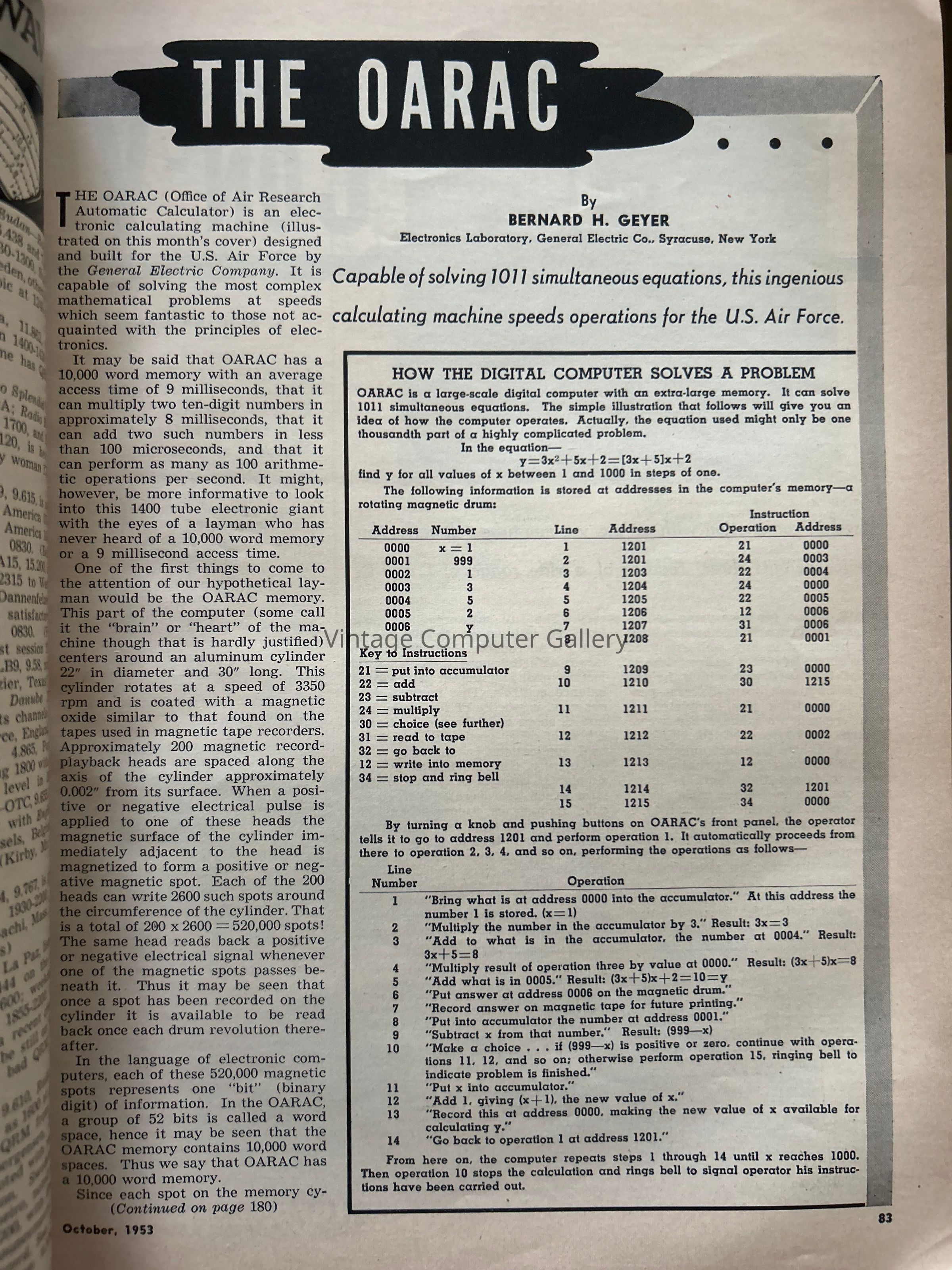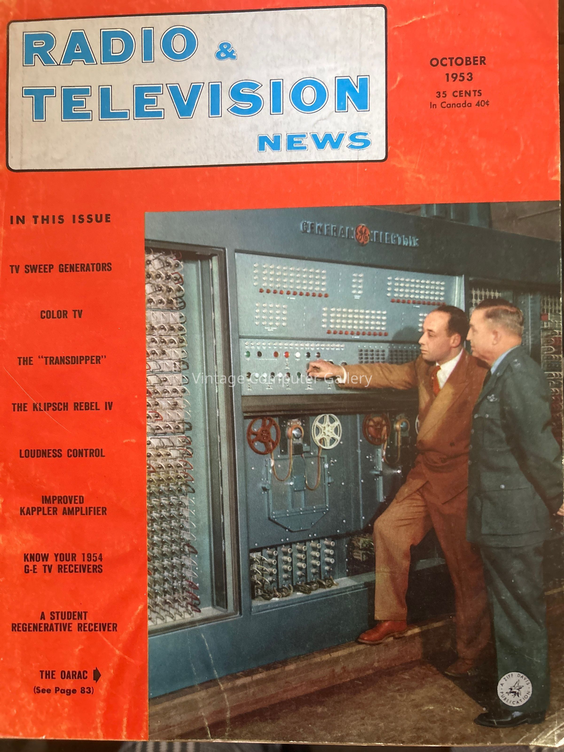 The article titled “The Oarac” from the October 1953 issue of Radio & Television News discusses the Office of Air Research Automatic Computer (OARAC).