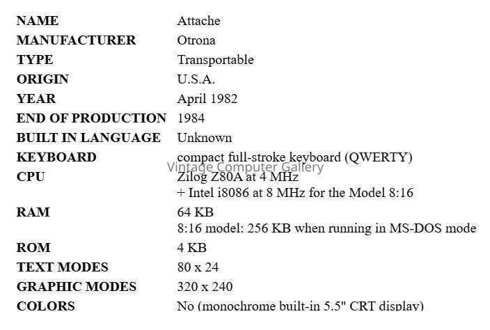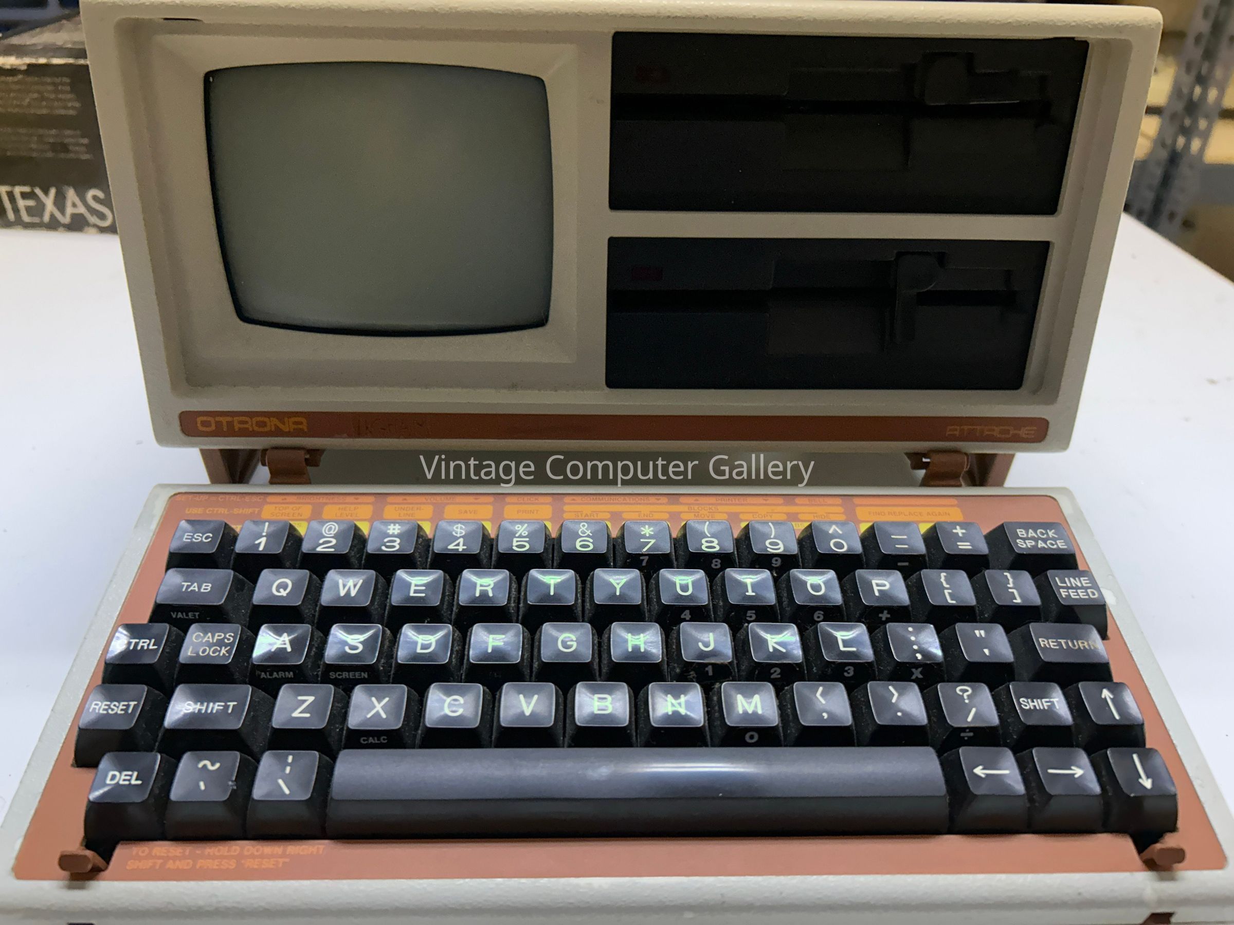 1982- The Otrona Attache was the most wanted transportable computer at the time as it was the smallest of its category. Preceded by the Osborne and Kaypro II, the Attache was also more expensive than its competitors. Compactness has a price! The Attache is this a nice little CP/M system. High-resolution graphics, compact keyboard, 64 KB RAM, real time battery-packed clock, composite video output, delivered with Wordstar, MBasic, CP/M, the Otrona Attache had all that was needed at the time to be efficient. in 1983, Otrona released a second model, the Attache 8:16 which was in fact a "normal" Attache with an Intel 8086 expansion board built-in, thus offering the MS-DOS world in addition to the CP/M compatibility. The IBM PC was already putting a strong pressure on the market. The rush toward MS-DOS compatibility had begun, announcing CP/M death. Meanwhile, hybrid machines like this one appeared on the market illustrating the transition.General Notes