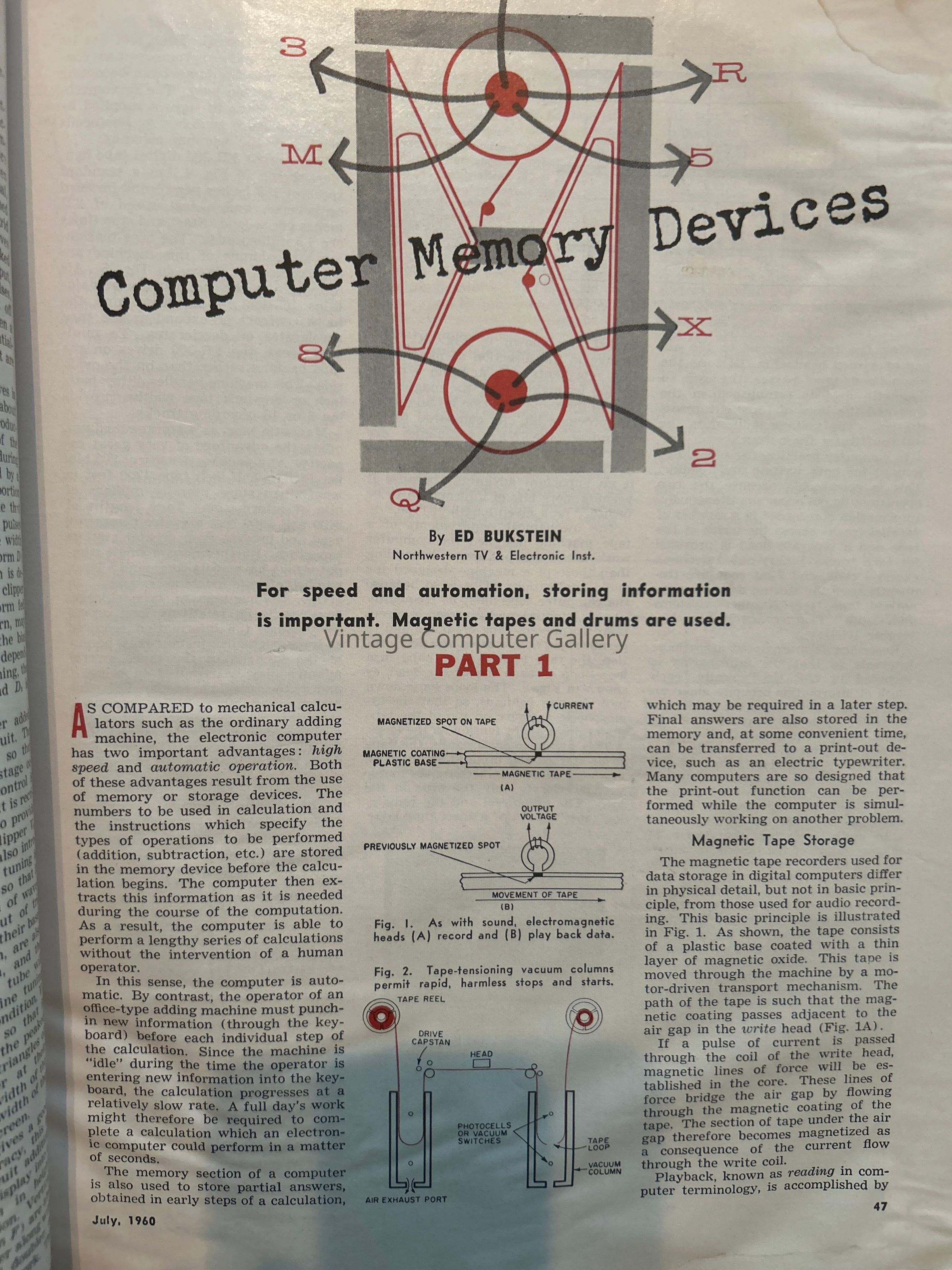 The July 1960 issue of “Electronics World” featured an article titled “Computer Memory Devices,” which discussed the state-of-the-art memory technologies used in computers at the time. Given the era, the article covered magnetic core memory and drum memory, which was the dominant form of computer memory in the 1960s. It might have also touched upon other memory devices such as magnetic drums, delay lines, and possibly early forms of semiconductor memory.
