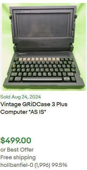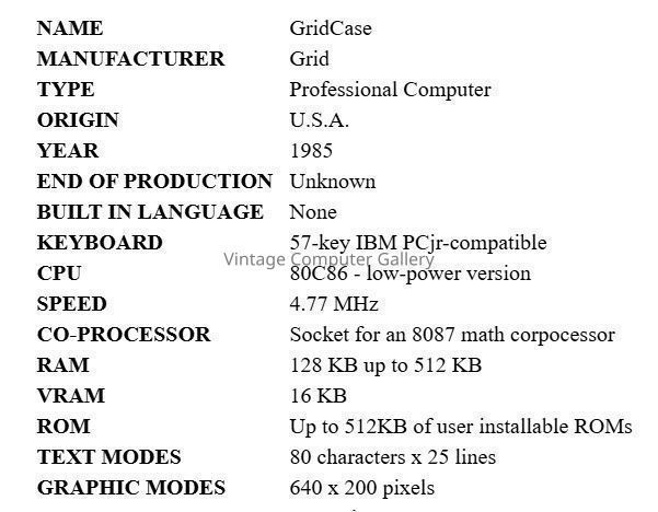 The GridCase was about the same size and featured the same robust magnesium case as Compass model, but Grid forwent the Compass's expensive and power-hungry electroluminescent display and bubble memory. The GridCase series was composed of 4 models. The GridCase I featured a bottom-of-the-range LCD display, the GridCase II had an enhanced LCD "that more than one person can read" Grid said, the GridCase III offered a high-contrast gas-plasma display (photo), and the GridCase IV which used a full size yellow electoluminescent screen that was also offered on the high end earlier Grid Compass Computers. The keyboard was the same as the IBM PCjr, not very convenient but with a good tactile feedback provided by a key click similar to that on the IBM PC. Two power modules were available, a rechargeable battery pack and an AC transformer. Both were the same size and fitted in a large socket on the rear panel. Each battery pack lasted 4 to 5 hours for the LCD models, and one hour with the plasma model. All models came with eight sockets for ROM chips. Although only four of them could be accessed by the user, Grid offered programs such as MS-DOS, GW-BASIC or Lotus 1-2-3 on ROM chips. Several peripherals were available, a base station battery charger and power source, a 5.25" and 3.5" floppy disk drive units and a 10 MB hard disk. They all were of the same size and could be stacked. Some of these systems were made for military use and included a built-in hard drive. A big thick X was pressed into the case over the hard drive. The purpose of this was to show the user where to shoot in case the computer was in danger of falling into enemy hands.General Notes