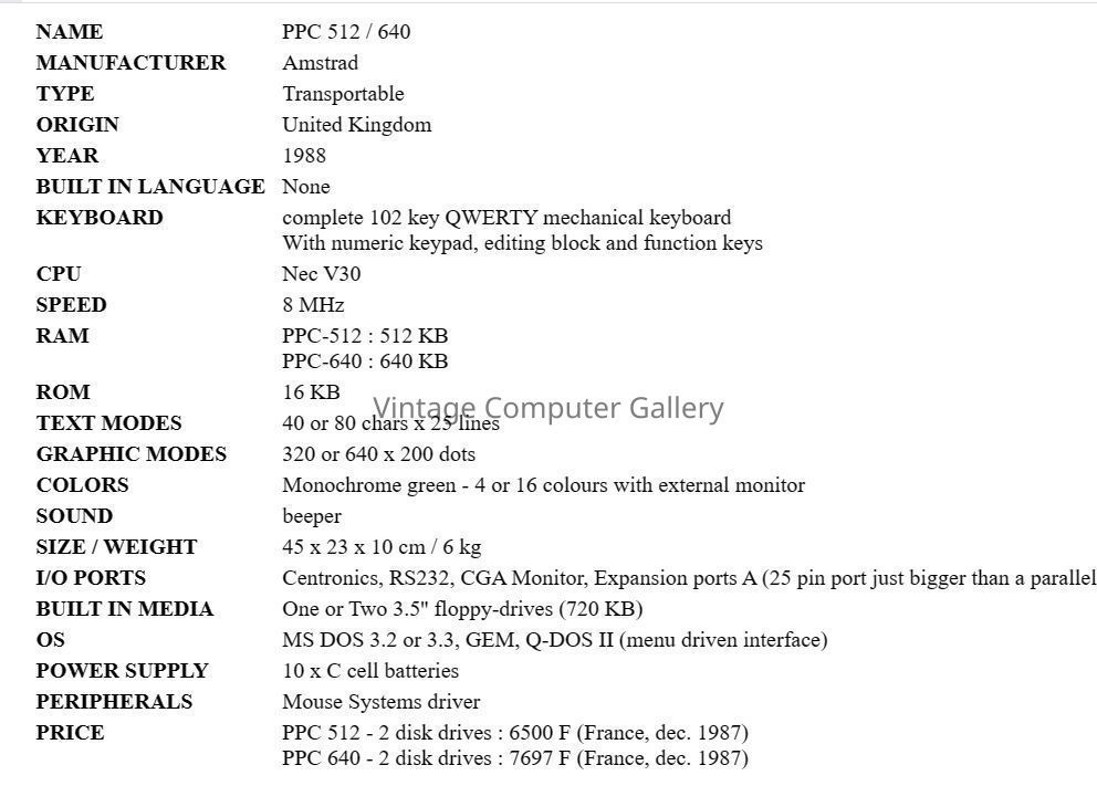 1988- With the Amstrad PPC-512 and 640, Amstrad wanted to make the cheapest portable PC compatible computer, in the same way as the Amstrad PC1512 was for desktop computers. But, despite its pleasant form, this computer suffered due to its poor 9" LCD screen. It had one or two 3.5" 720 KB floppy drives and some versions could also be found with a 10 or 20 MB internal hard disk. If you were tired of the poor LCD screen, you could connect a monochrome or CGA monitor to the PPC at home. The Amstrad CPC series monitors could be used too. The differences between the PPC-512 and PPC-640 were a different colour case, a built-in modem (v21, v22, v22 bis and v23 protocols) and 640 KB RAM for the PPC-640. Both versions could run with 10 C size batteries (1 hour battery life), or with an external AC adaptor.