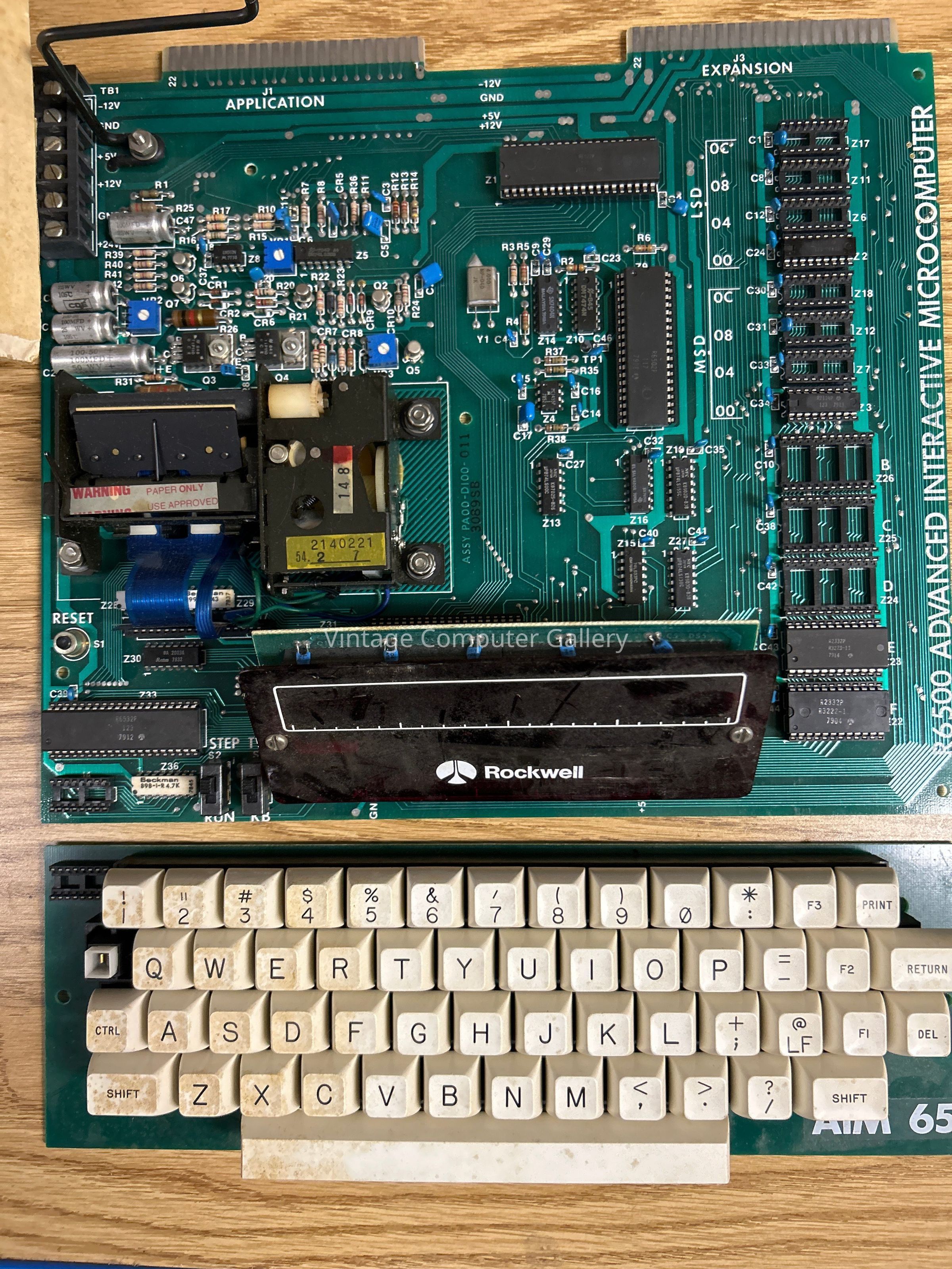 This strange computer was designed to be a development system for 6502 based computers. It had no display except for a small 20 character LED screen and a very small thermal printer located directly on the motherboard which could print everything that was typed on the keyboard. The board featured five 4 KB-ROM sockets. Two of them were dedicated to the AIM monitor program, including an instant input assembler (no labels) and a disassembler. Various programming languages (BASIC, FORTH...) or custom applications could be added in the three remaining sockets. Several cards were developed for this machine, especially language cards and ROMs: a BASIC card (BASIC language with floating point mathematics capabilities), PL/65 (a mixture of the PL/1 and Algol languages), Instant Pascal (an interpreted version of Pascal), Assembler and the FORTH programming language.Acquisition