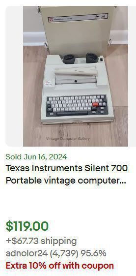1975- The Silent 700 was a line of portable computer terminals manufactured by Texas Instruments in the 1970s and 1980s. Silent 700s printed with a dot-matrix heating element onto a roll of heat-sensitive paper. They were equipped with an integrated acoustic coupler and modem that could receive data at 30 characters per second.Acquisition