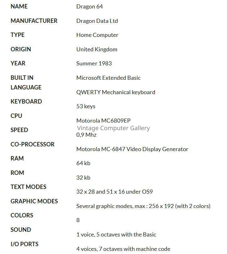The Dragon 64, launched in 83, was exactly the same computer as the Dragon 32, except that it had 64k RAM instead of 32k, an OS9 operating system and a RS232C connector.