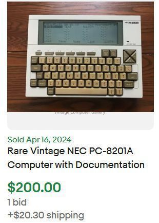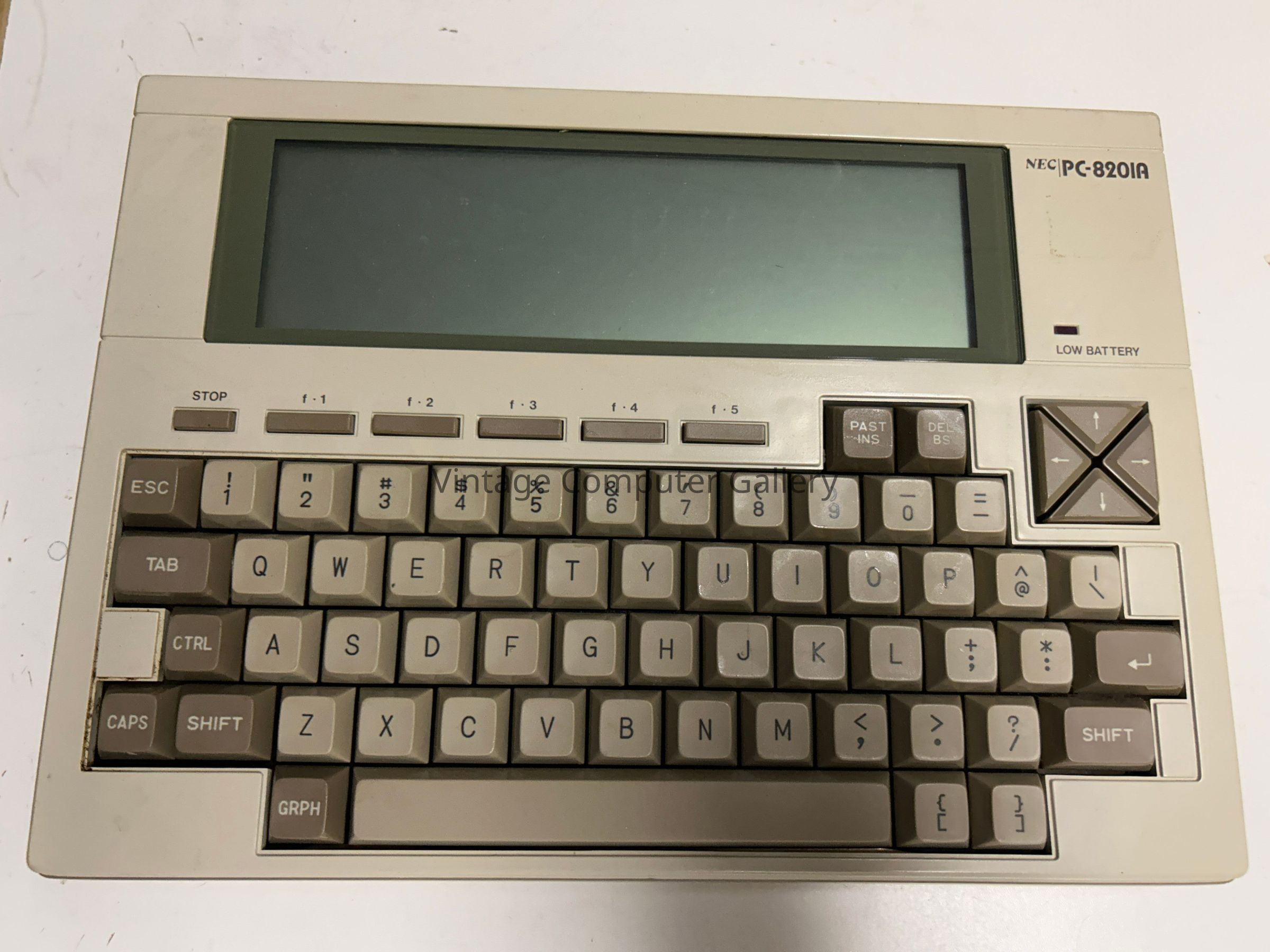 Sheduled to be released in the U.S. in 1983 summertime, the PC-8201 was expected to compete directly with Tandy Model 100. Both machines were very similar, but the NEC could expand its internal RAM memory from 16 KB to 64 KB (only 32 KB for the Model 100). The 8201's 32 KB ROM contained the operating system, Microsoft BASIC interpreter, a simple text-editing program and a telecommunication program. It could display the full 128 ASCII character set as well as Japanese Katakana characters and 61 user-definable characters. Nec produced its own range of peripherals for the 8201, like a floppy disc controller (PC-8233) and various floppy drive units, including the most sold 3.5" unit (PC-8031). A video monitor adapter (PC-8240), an acoustic modem and a bar-code reader were also available. Same hardware basis, made in fact by Kyocera, was also sold as the Tandy (TRS-80) Model 100 (USA), Olivetti M10 (Europe), and Kyocera Keytronic (Asia).Acquisition