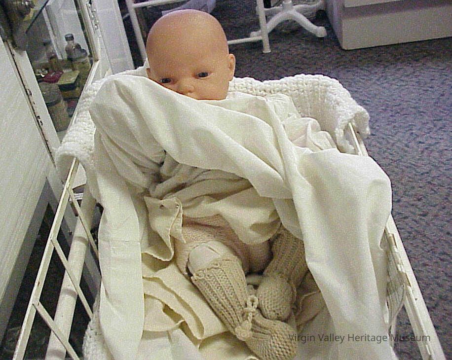 A set of pioneer baby clothes that was worn by Maurine Abbott Hughes, who was born in 1914. The white shawl was crocheted by Velate Hughes Knight Hardy (1903-2002), who was a life-long resident and pioneer of Mesquite. In the olden days, newborn babies would have their eyes washed with boric acid water. Whiskey was then used as an antiseptic rub and consecrated oil was used to soothe the skin. Finally, a pinch of sugar was wrapped in a small piece of cloth and used as a "sugar tit" to keep the baby from crying.