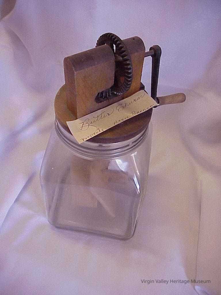 A Dazey butter churn owned by Angie Hughes Barnum. Angie married Orange Barnum on April 28, 1925. Angie was known around Mesquite in her youth for playing the drums for dances and other events. Angie worked at the Virgin Valley school as a nurse and became good friends with Edith Knight. She passed away on October 13, 1991.