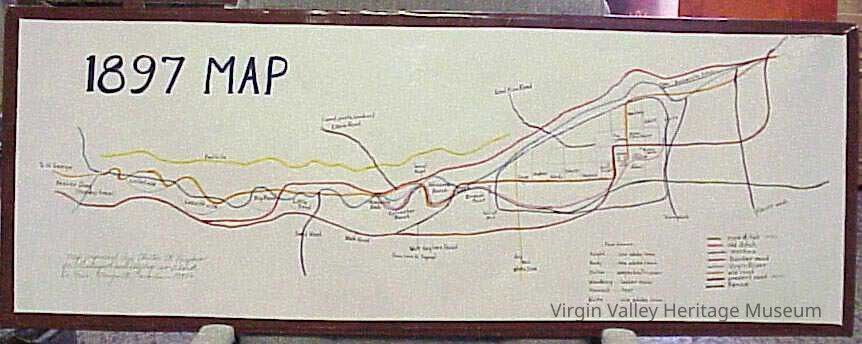 1897 Map of the Virgin river St. George to Abbott Wash in Mesquite Drawn by W.W. Hughes. Displayed in the 1950 Co. Fair