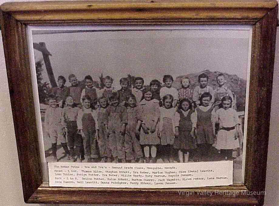 1919-1920 2nd grade class at Mesquite, Nv. Front L-R Thomas Allen Stephen Abbott, Ira Reber, Marion Hughes, Glenn(Pete) Leavitt, Iren Tobler, Evelyn Potter, Iva Reber, Millie Hardy, Ruby Barnum, Rayola Jensen, Back L-R Dellon Potter, Rulon Abbott, Burton Geuaro,Jack Waymire, Hyrum Potter, Lena Barnum, Iola Guearo, Nell Leavitt, Donna Pulsipher, Perry Abbott, Lavon Jensen, Teacher was- Hazel Kapple