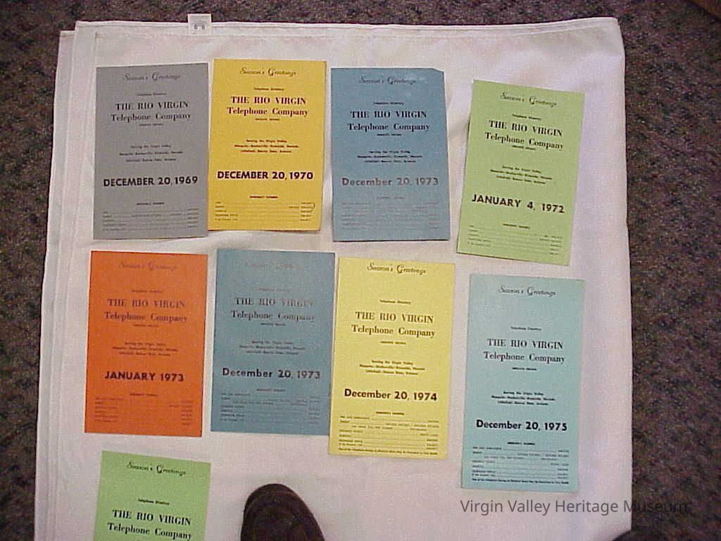 A collection of telephone directories from the Rio Virgin Telephone Co., which was first established in 1913. The directories themselves range from 1969 to 2005.