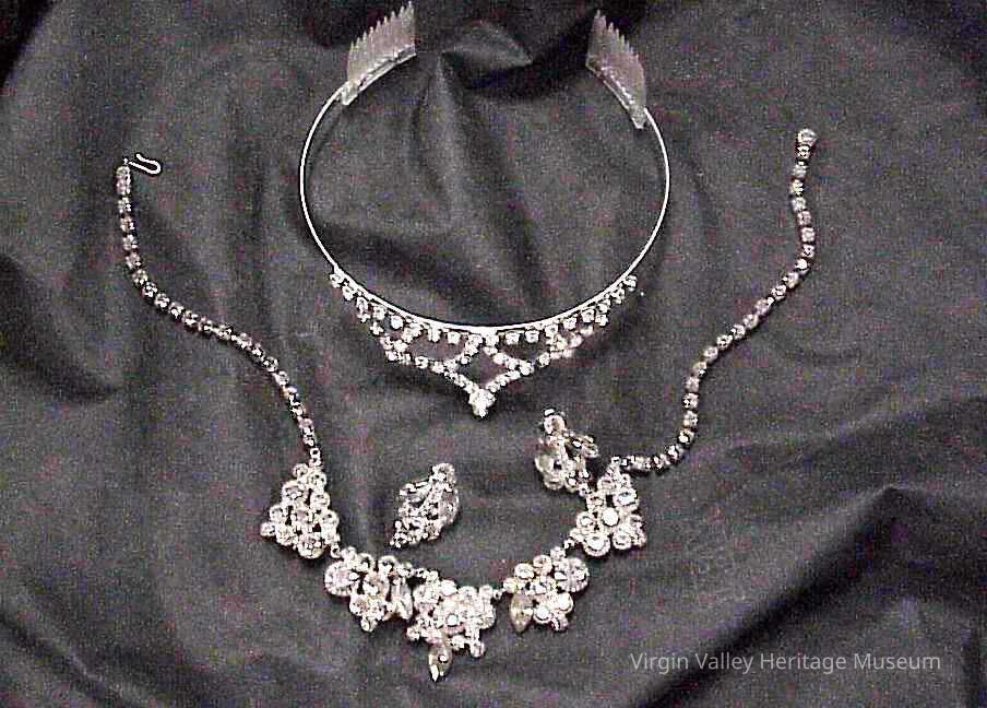 This costume jewelry is comprised of a tiara, necklace, and earrings and was donated by the Waite Family.