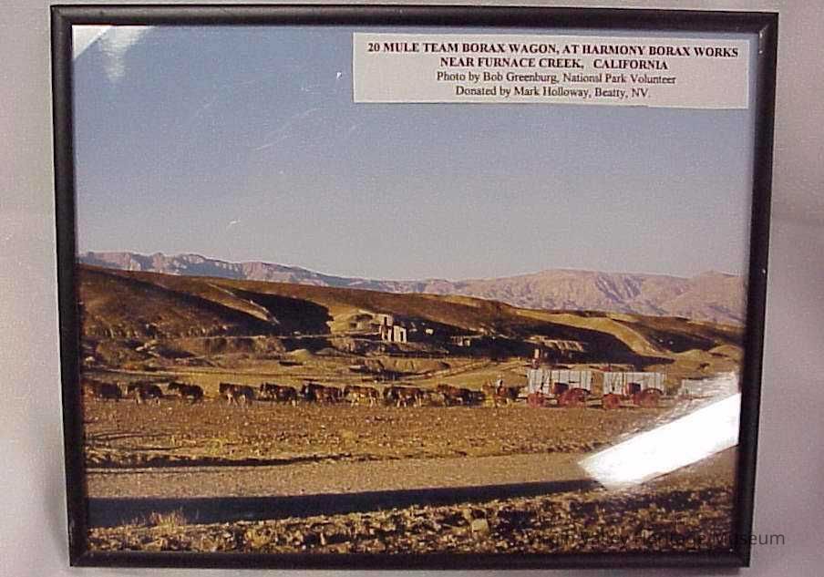 20 Mule Team Borax Wagon, at Harmony Borax Works near Furnace Creek, Calif. taken in 1999 by Bob Greenburg during the annual "death Valley 49ers Encampment". The wagons in the photograph are the original and are loaned for the event courtesy of US Borax. This was to be the last time they will be used due to age of the equipment. The first two animals in front are actually horses. this was a common configuration of a 20 mule team was actually 18 mule team with two horses.