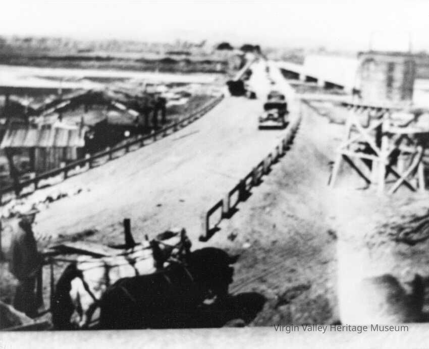 Constructed and completed by the state highway department, it replaced the old bridge at the right. Two years later a permanent bridge was also completed across the Virgin River at Riverside, eight miles west of Bunkerville. Ralston Reber is shown with his father's team of horses. Namely L to R: Mac and Bess. During construction period he towed cars and trucks across the River.