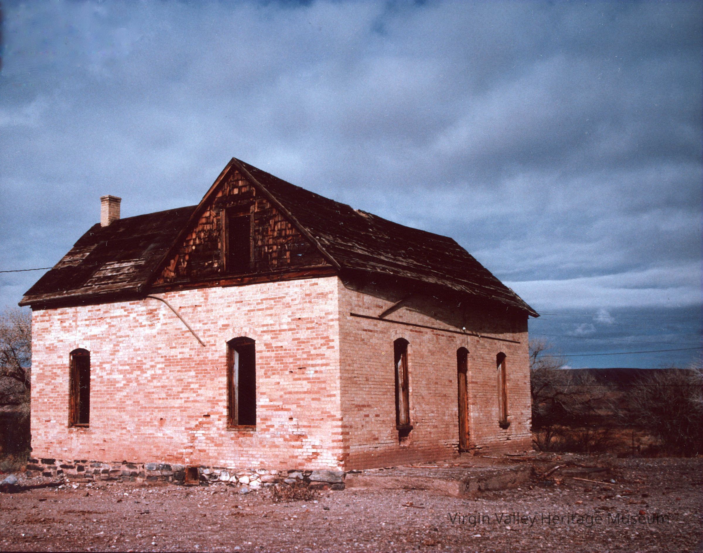 Picture of old house across from falls in Bunkerville. Built by Dudley Leavitt Jr. about 1898 bricks made by the Fobbin brothers property and home belongs to Venna Davis of Las Vegas, Nv.
