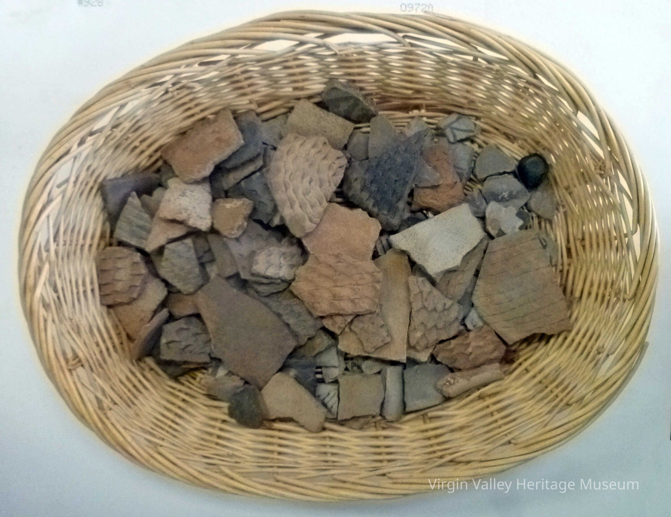 A collection of Native American pottery shards from around 1200-1400 AD that were found in the local area. The shards were donated by Nora and Esmond Hughes.