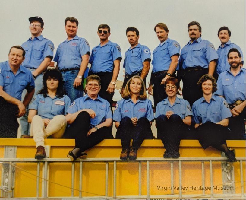 Bunkerville Fire Dept. & Paramedics. Back row L-R Corey Houston, Craig Anderson, Dannie Leavitt, Vay Mickelson, Steve Miller, DJ Jensen, Kurt Hughes. Front row L-R Eric Laub Suzette Baeza, Judy Laub, Karla Jensen, Loy Houston-West, Janell Jensen, Mark West.