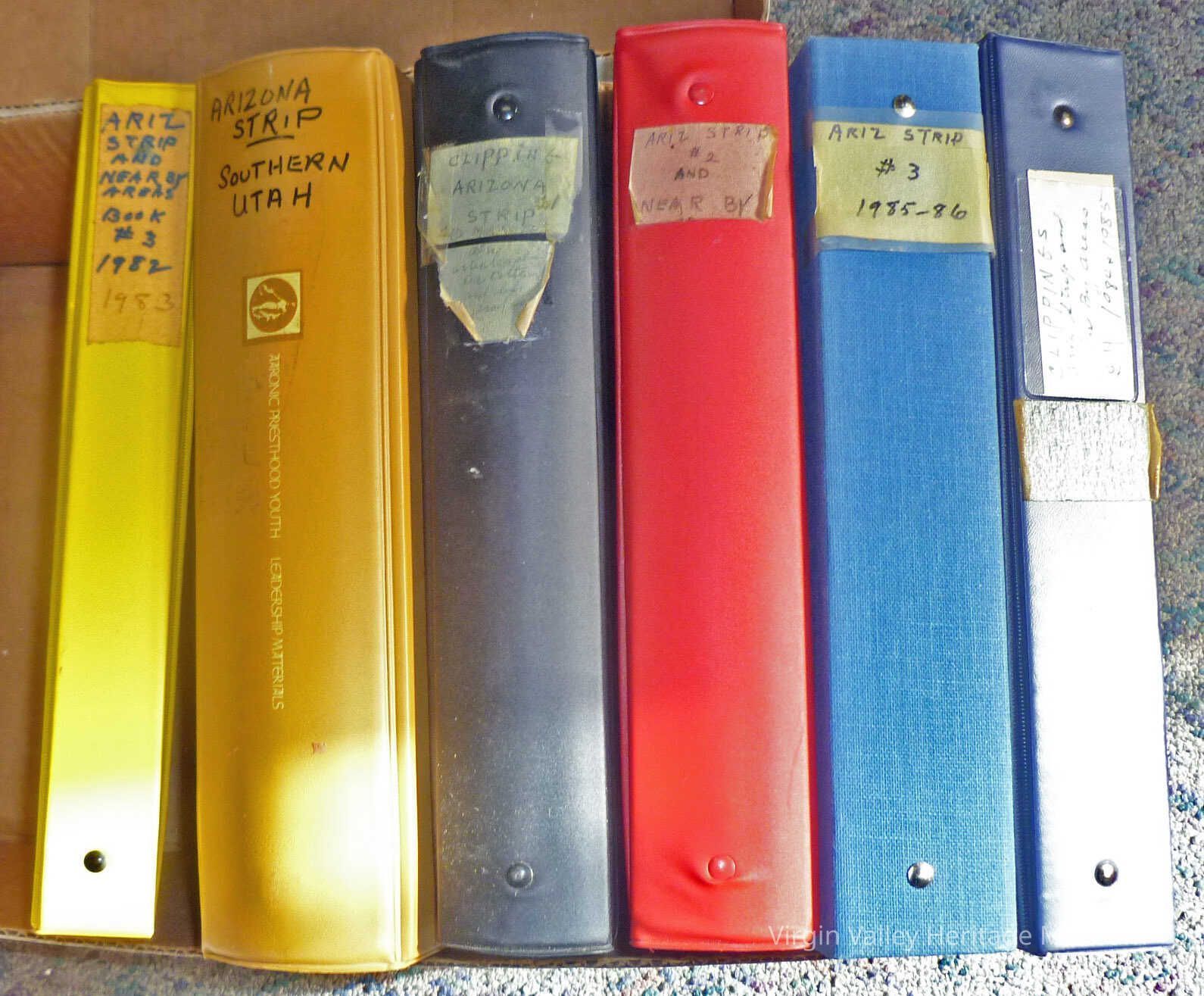 6 notebooks of clippings and news articles of the Arizona strip and Beaver Dam and Littlefield. Art Combe had the (Famous) Nut Farm in Beaver Dam. On3e notebook includes Bunkerville.
