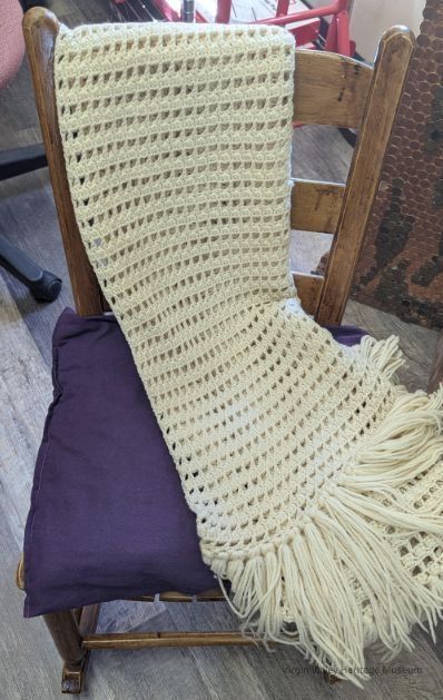 A small rocking chair that belonged to Nevada Hardy Pulsipher. There is a purple cushion on the seat and a crocheted furniture scarf.