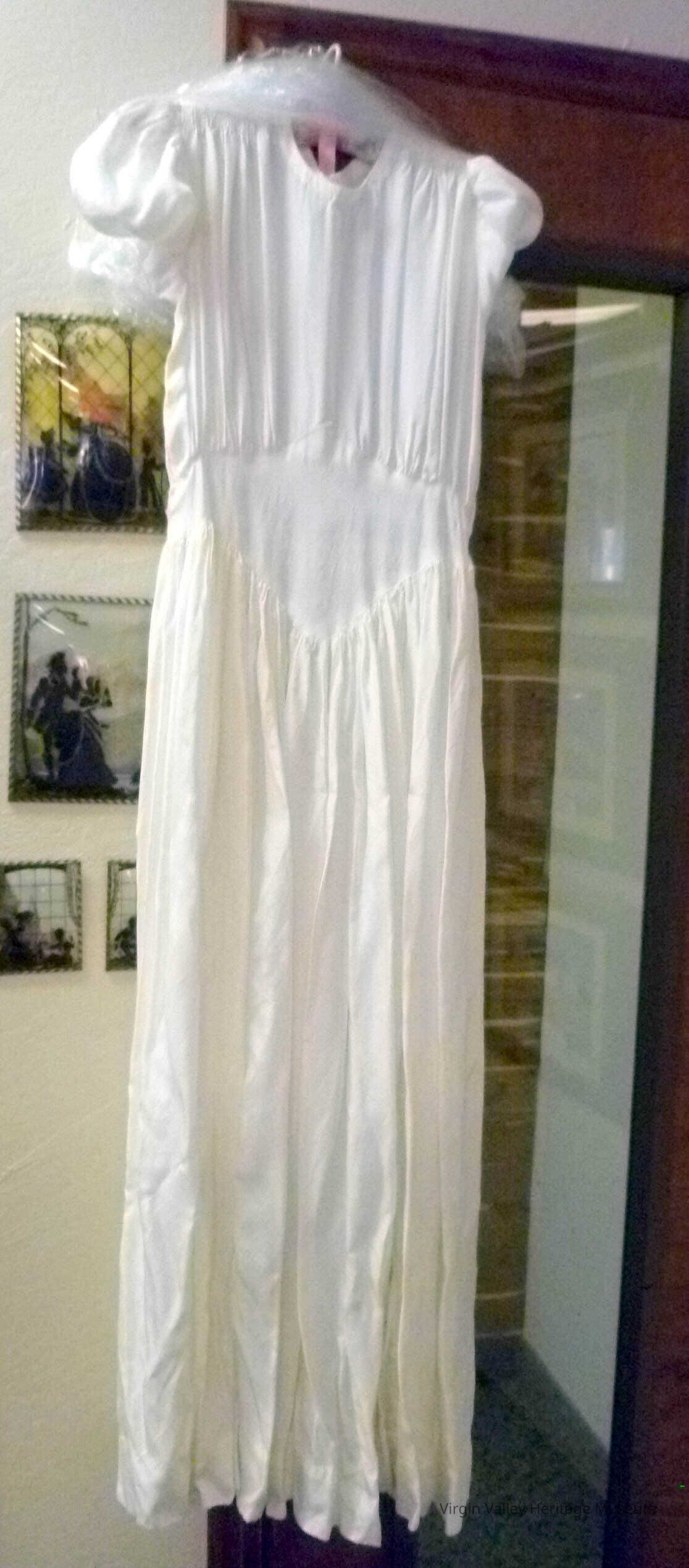 This wedding dress belonged to Amy Leavitt, who married Jack Wendell Leavitt. Amy was the daughter of Charles Albert and Lillie May Barnum Leavitt, and Jack was the son of John Austin and Lillian Wittwer Leavitt. The two were both born and raised in Bunkerville, and got married on March 13, 1940. On July 3, 1944, Jack was drafted into the army during WWII. While away, Jack regularly sent Amy letters and poems. When the letters stopped coming, Amy knew something was wrong. Soon after the last letter arrived, Amy received a telegram informing her that Jack had been killed in action on March 26, 1945, on an island near Okinawa, Japan. She passed away in 2012 and was buried next to Jack in the Bunkerville cemetery.