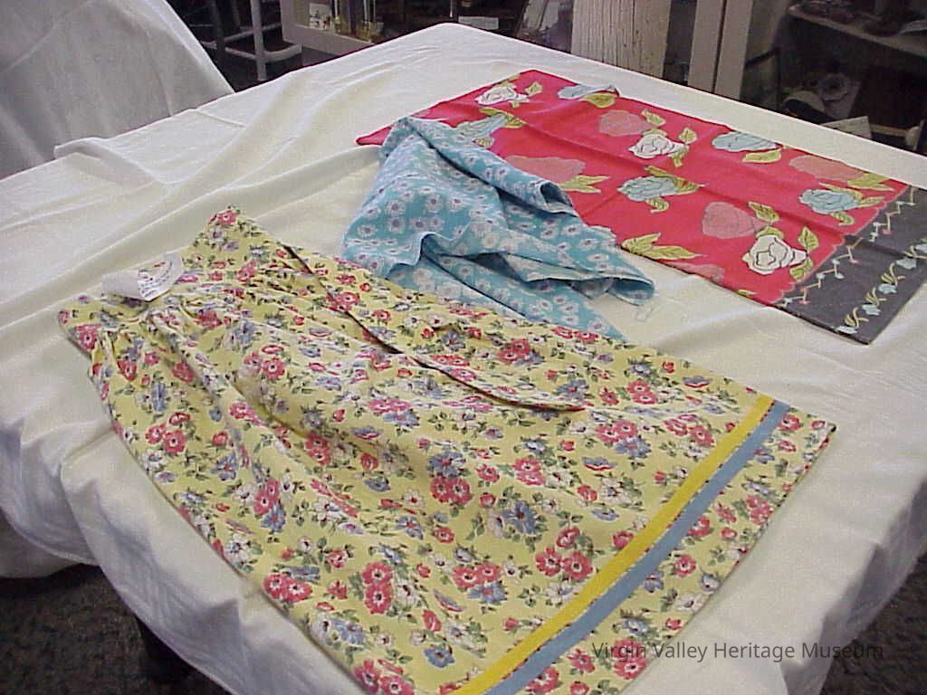 These patterned flour sacks were repurposed to serve a variety of functions, including being used as: aprons, towels, and tablecloths. These were donated to the museum by Myrtle and Ralston Reber.