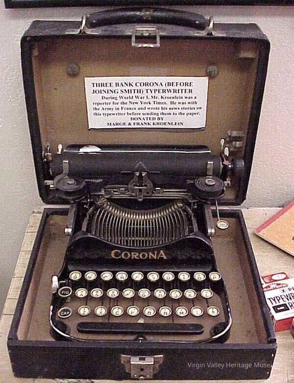 A three bank Corona typewriter. It was used by Frank Kroenlein in WWI. Frank was a reporter for the New York Times and, while serving for the army in France, he would use this typewriter to write up stories to send to the New York Times.