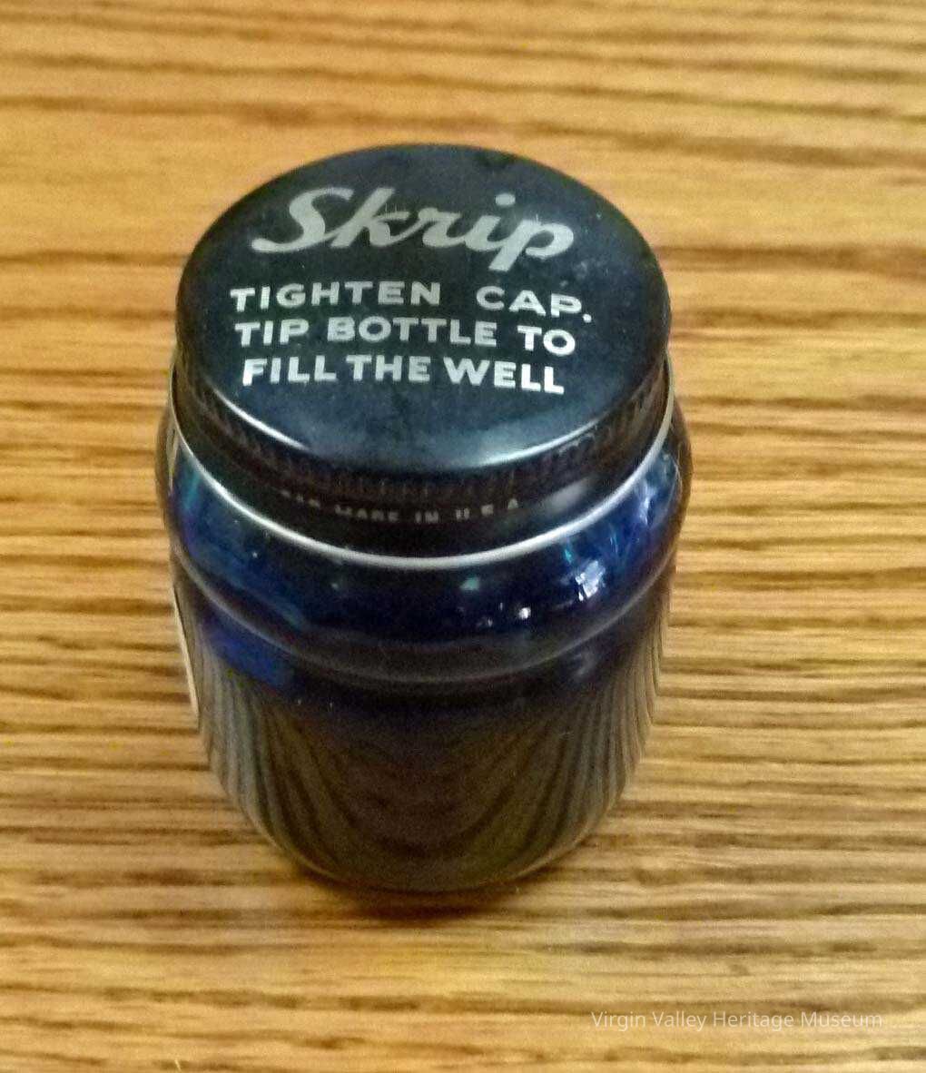 A full bottle of Sheaffer's Skrip Permanent Royal Blue Ink from the 1940s.