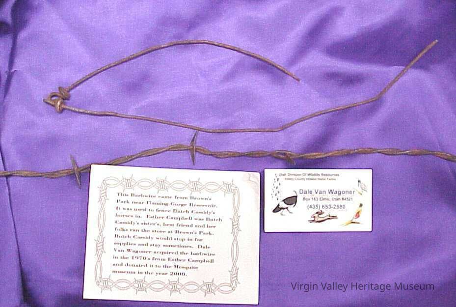 Barbwire - Came from Brown's Park near Flaming Gorge Reservoir. It was used to fence Butch Cassidy's horses in. Esther Campbell was Butch Cassidy's sister's, best friend and her folks ran the store in Brown's Park. Butch Cassidy would stop in for supplies and stay sometimes.