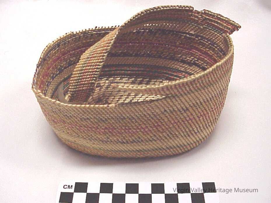 A Native American basket cap likely worn by women to protect their heads from their tumplines. Tumplines were straps Native American women would wrap around their head and use to help them carry heavy burdens, such as canoes or water jugs.