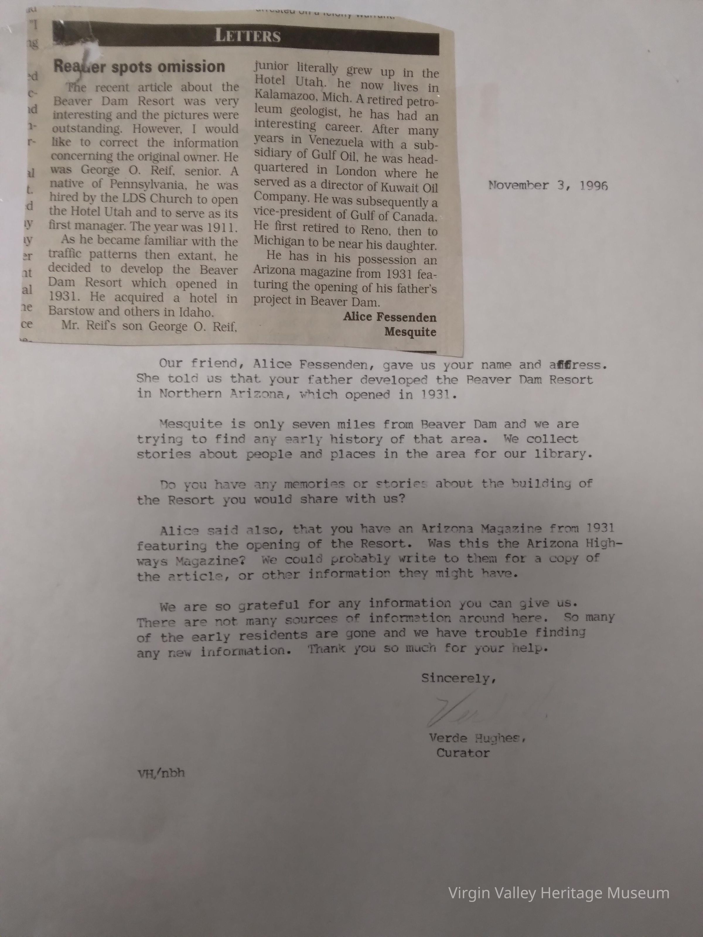 Beaver Damn Resort Letter 1996