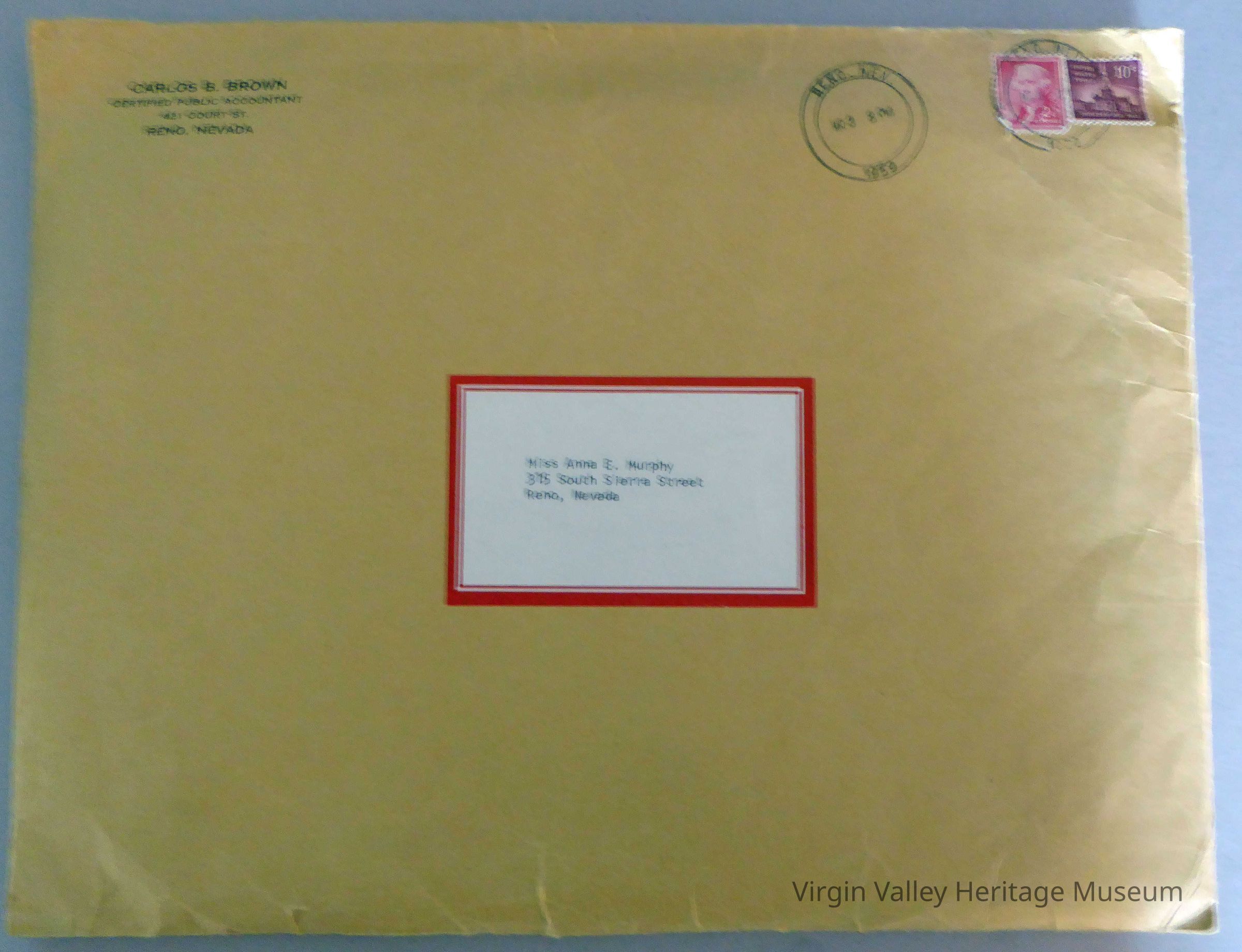 Manilla folder from Carlos B. Brown of Reno Nv Post dated Mar 3 1959. Addressed to Miss Anna Murphy.
