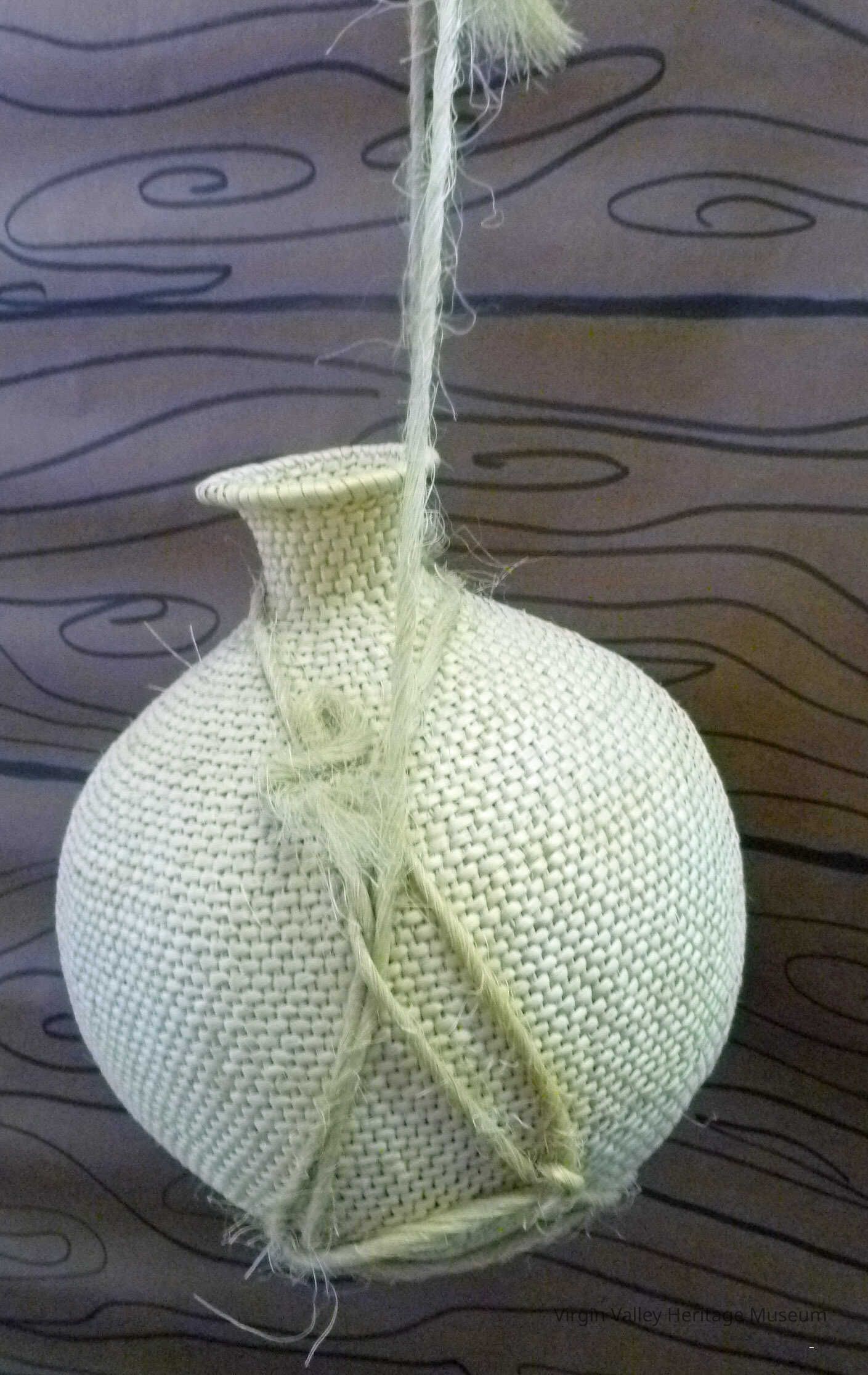 A Paiute water basket used to store liquids while travelling. The bottle was waterproofed with tar from pine trees and was woven by "Rowdy" Everett Pikavit.