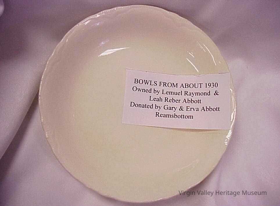 Bowls belonging to Lemuel Raymond and Leah Reber Abbott around the 1930s. The two were married May, 1931 and lived in Mesquite until 1943.