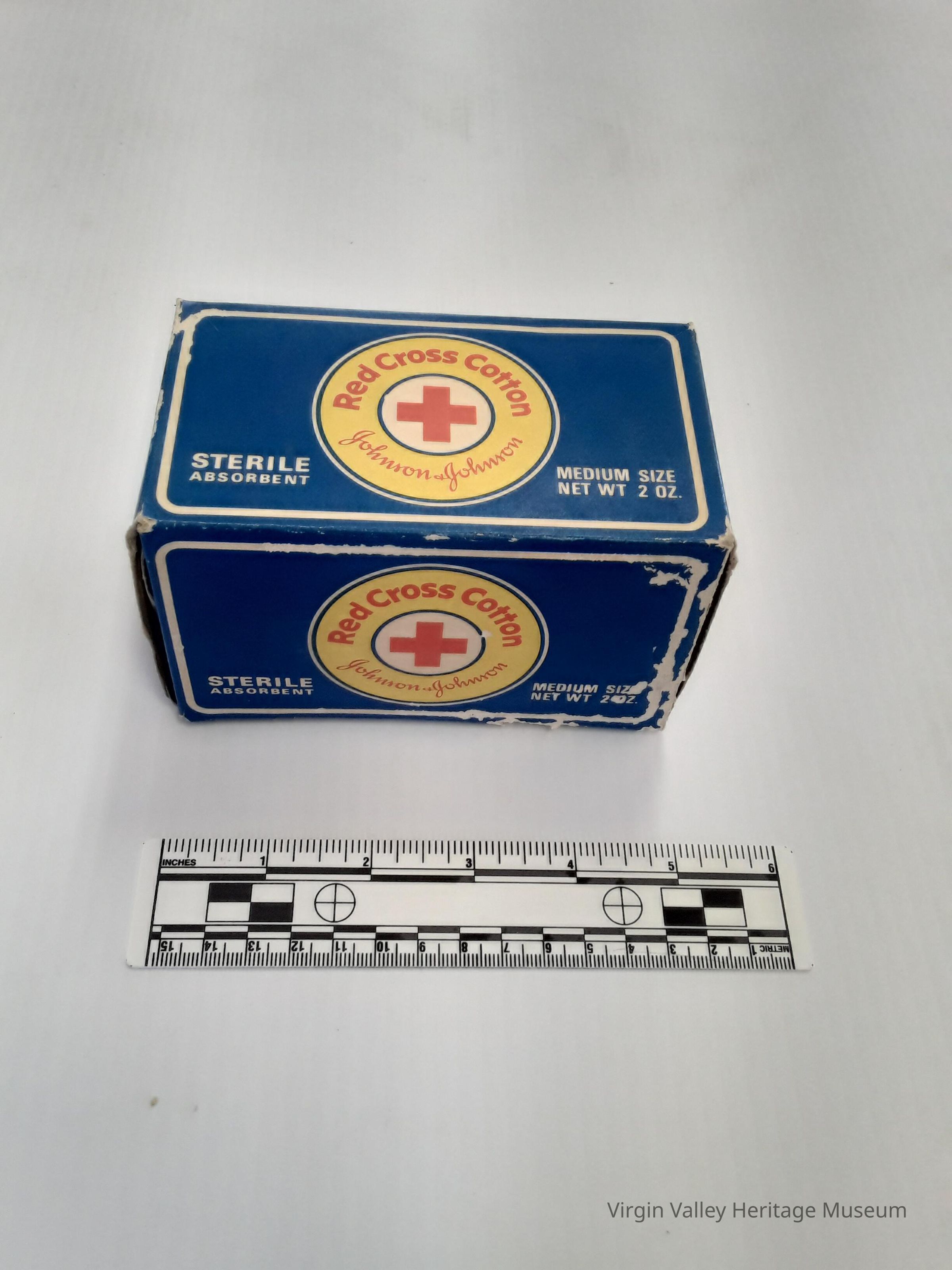 A box of Red Cross Cotton produced by Johnson and Johnson circa 1970.