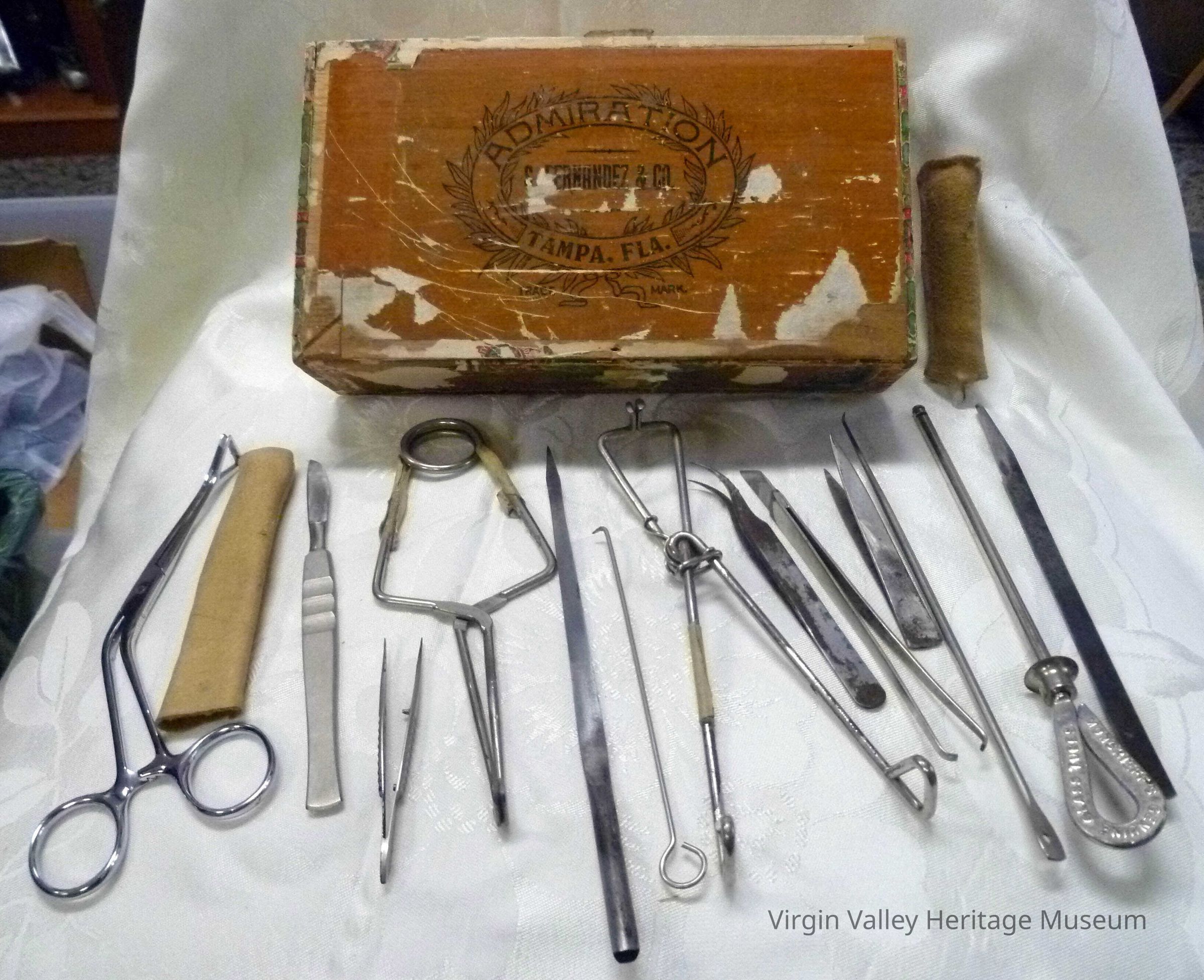 A wooden cigar box filled with medical equipment, including: tweezers, hand-made knifes, a sharpening stone, and hand-held forceps.