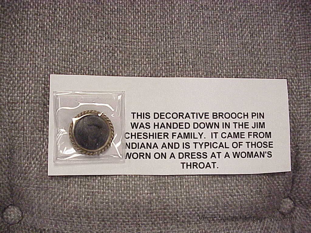Brooch with picture. Made in Indiana. Worn on a dress at a women's throat
