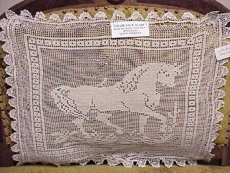 A chair back scarf that was made by Mary Ann Stucki Hafen. Mary Ann was born in Switzerland on May 5, 1854, and immigrated to the U.S. in 1860 to join other members of the Church of Jesus Christ of Latter-Day Saints. She was only six years old when she travelled across the U.S. to Utah via a handcart company. Mary Ann moved to Nevada in 1891 and became one of early settlers of the Bunkerville and Mesquite area. She was the second of John George Hafen's four wives, and ended up raising her family practically by herself when she moved to Bunkerville, as John George had to spend most of his time in Santa Clara with his other wives and their families. The story of Mary Ann truly highlights the resilience, work ethic, and determination of many of the Valley's early pioneer women.