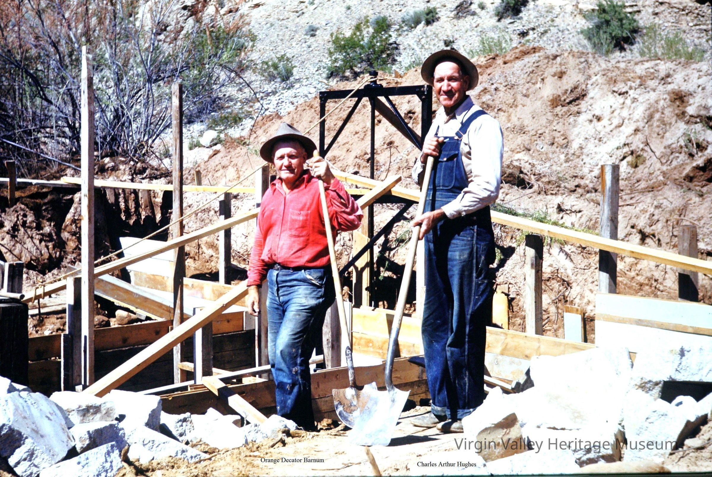 A picture of Charles Arthur Hughes and Orange Decator Barnum working together to build something in the nearby mountains.